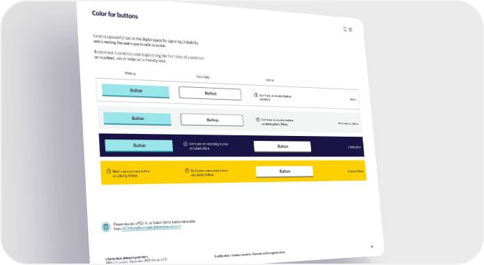Color for „uttons €olor is a powerful tool in the digital space for signaling clic ability and directing the user’s eye to calls to action. …utton text is sentence case (capitaližing the first letter of a sentence or headline) which helps set a friendly tone. ›riary œecondary ‰nverse Button Button on’t use an inverse button £hite on £hite. Button Button on’t use an inverse button tospheric £hite on tospheric £hite. Button on’t use an secondary button Button Liberty …lue on Liberty …lue. on’t use a priary button on’t use a secondary button Button Liberty ¢ellow on Liberty ¢ellow. on Liberty ¢ellow. ›lease re™uest a ›œ ‰ or œ etch file for button teplates fro ¡œ€M…randœtandards“libertyutual.co. Liberty Mutual brand guidelines GRM U.S. section—September 2020 (Version 2.3) Confidential—Internal use only—Content not for reproduction 2 …