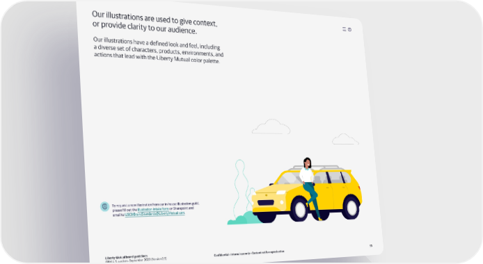 Our illustrations are used to give context, or provide clarity to our audience. Our illustrations have a defined look and feel, including a diverse set of characters, products, environments, and actions that lead with the Liberty Mutual color palette. To request a new illustration from our in-house illustration guild, please fill out the illustration intake form on Sharepoint and email to USCMBrandStandards@LibertyMutual.com. Liberty Mutual brand guidelines GRM U.S. section—September 2020 (Version 2.3) Confidential—Internal use only—Content not for reproduction 53