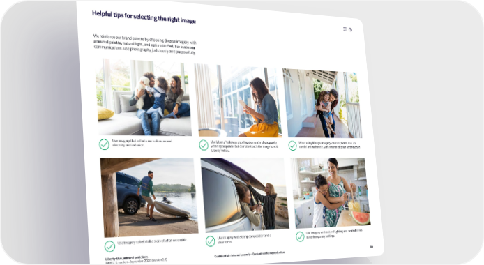 Helpful tips for selecting the right image We reinforce our brand palette by choosing diverse imagery with a neutral palette, natural light, and optimistic feel. For customer communications, use photography judiciously and purposefully. Use imagery that reflects our values around Use Liberty Yellow as a styling element in photography When using lifestyle imagery, choose photos that are diversity and inclusion. when appropriate, but do not retouch the image to add candid and authentic, with a sense of place and emotion. Liberty Yellow. Use imagery to help tell a story of what we enable. Use imagery with strong composition and a Use imagery with natural lighting and neutral tones clear focus. in contemporary settings. Liberty Mutual brand guidelines GRM U.S. section—September 2020 (Version 2.3) Confidential—Internal use only—Content not for reproduction 49