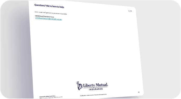 Questions? We’re here to help. Email us and we’ll get back to you as soon as possible. USCM Brand Standards Team USCMBrandStandards@LibertyMutual.com Liberty Mutual brand guidelines GRM U.S. section—September 2020 (Version 2.3) Confidential—Internal use only—Content not for reproduction 109
