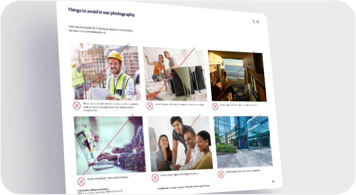 Things to avoid in our photography Here are examples for helping us maintain consistency across all our communications. While a natural smile into the camera can be acceptable, Avoid contrived lifestyle situations and extreme angles. Avoid imagery where color is overly saturated. avoid using photographs that feel manufactured or overly posed. Avoid using highly manipulated imagery. Avoid using imagery with staged diversity. Avoid imagery that feels cold or corporate. Liberty Mutual brand guidelines GRM U.S. section—September 2020 (Version 2.3) Confidential—Internal use only—Content not for reproduction 50