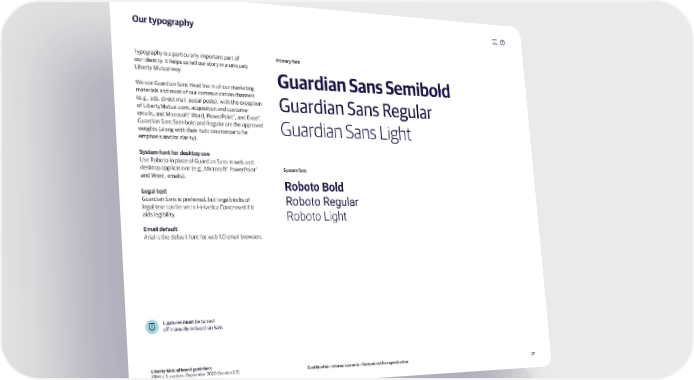 Our typography Typography is a particularly important part of Primary font our identity. It helps us tell our story in a uniquely Liberty Mutual way. We use Guardian Sans Headline in all our marketing Guardian Sans Semibold materials and most of our communication channels (e.g., ads, direct mail, social posts), with the exception Guardian Sans Regular of LibertyMutual.com, acquisition and customer emails, and Microsoft® ® ® Word, PowerPoint , and Excel . Guardian Sans Semibold and Regular are the approved weights (along with their italic counterparts for Guardian Sans Light emphasis and/or clarity). System font for desktop use Use Roboto in place of Guardian Sans in web and desktop applications (e.g., Microsoft® PowerPoint® System font and Word, emails). Roboto Bold Legal text Guardian Sans is preferred, but large blocks of Roboto Regular legal text can be set in Helvetica Condensed if it aids legibility. Roboto Light Email default Arial is the default font for web 1.0 email browsers. Ligatures must be turned off manually in Guardian Sans. Liberty Mutual brand guidelines GRM U.S. section—September 2020 (Version 2.3) Confidential—Internal use only—Content not for reproduction 27