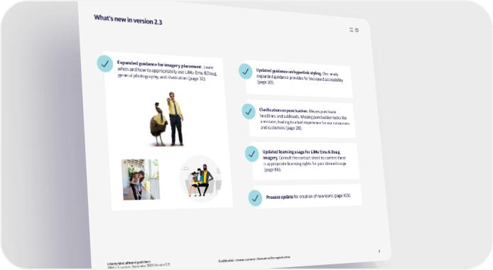 What’s new in version 2.3 Expanded guidance for imagery placement. Learn Updated guidance on hyperlink styling. Our newly when and how to appropriately use LiMu Eu oug expanded guidance provides for increased accessibility general photography and illustration (page 2). (page 20). Clarification on punctuation. lways punctuate headlines and subheads. Missing punctuation loo s li e a ista e leading to a bad experience for our consuers and custoers (page 2). Updated licensing usage for iu Emu oug imagery. €onsult the contact sheet to confir there is appropriate licensing rights for your desired usage (page ‚). rocess update for creation of new icons (page ƒ0). Liberty Mutual brand guidelines GRM U.S. section—September 2020 (Version 2.3) Confidential—Internal use only—Content not for reproduction 2