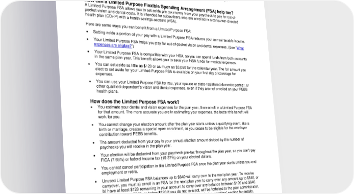 The Health Care Authority contracts with Navia Benefit Solutions to manage the Limited Purpose Flexible Spending Arrangement (FSA), process claims, and provide customer service for Public Employees Benefits Board (PEBB) employees. Who is eligible? The Limited Purpose FSA is available to PEBB benefits-eligible employees who work at state agencies, higher-education institutions, and community and technical colleges as described in Washington Administrative Code (WAC) 182-12-114. How can a Limited Purpose Flexible Spending Arrangement (FSA) help me? A Limited Purpose FSA allows you to set aside pre-tax money from your paycheck to pay for out-of- pocket vision and dental costs. It is intended for subscribers who are enrolled in a consumer-directed health plan (CDHP) with a health savings account (HSA). Here are some ways you can benefit from a Limited Purpose FSA: • Setting aside a portion of your pay with a Limited Purpose FSA reduces your annual taxable income. • Your Limited Purpose FSA helps you pay for out-of-pocket vision and dental expenses. (See “What expenses are eligible?”) • Your Limited Purpose FSA is compatible with your HSA, so you can spend funds from both accounts in the same plan year. This benefit allows you to save your HSA funds for medical expenses. • You can set aside as little as $120 or as much as $3,050 for the calendar year. The full amount you elect to set aside for your Limited Purpose FSA is available on your first day of coverage for expenses. • You can use your Limited Purpose FSA for you, your spouse or state-registered domestic partner, or other qualified dependent’s vision and dental expenses, even if they are not enrolled on your PEBB health plans. How does the Limited Purpose FSA work? • You estimate your dental and vision expenses for the plan year, then enroll in a Limited Purpose FSA for that amount. The more accurate you are in estimating your expenses, the better this benefit will work for you. • You cannot change your election amount after the plan year starts unless a qualifying event, like a birth or marriage, creates a special open enrollment, or you cease to be eligible for the employer contribution toward PEBB benefits. • The amount deducted from your pay is your annual election amount divided by the number of paychecks you will receive in the plan year. • Your election will be deducted from your paycheck pre-tax throughout the plan year, so you don’t pay FICA (7.65%) or federal income tax (10-37%) on your elected dollars. • You cannot cancel participation in the Limited Purpose FSA once the plan year starts unless you end employment or retire. • Unused Limited Purpose FSA balances up to $640 will carry over to the next plan year. To receive carryover, you must a) enroll in an FSA for the next plan year to carry over any amount up to $640, or b) have at least $120 remaining in your account to carry over any balance between $120 and $640. Any funds above $640, or below $120 if you do not re-elect, will be forfeited to the plan administrator, the Health Care Authority. See the “Carryover and claim submission deadline” section for details. • You must enroll in a Limited Purpose FSA again for each year you want to participate. Enrollment does not automatically continue from plan year to plan year. When can I enroll and how do I do it? There are three occasions when you are eligible to enroll in a Limited Purpose FSA. 1. You are newly eligible. Enroll no later than 31 days after the date you become eligible for PEBB benefits. To enroll, fill out the PEBB Midyear Enrollment Form and return it to your payroll or benefits office. You can find the form online at pebb.naviabenefits.com, or request it from your employer. 3