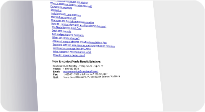 Table of Contents Who is eligible? How can a Limited Purpose Flexible Spending Arrangement (FSA) help me? How does the Limited Purpose FSA work? When can I enroll and how do I do it? When does my coverage begin? Whose expenses qualify? What health care expenses are eligible? When is additional documentation required? Orthodontia expenses Stockpiling Ineligible health care expenses How do I get reimbursed? Carryover and the claim submission deadline How do I receive information from Navia Benefit Solutions? The Navia Benefits Debit Card Debit card requests IIAS and participating merchants When can I make changes? Approved leave of absence (including Leave Without Pay) Transfers between state agencies and higher-education institutions Continuation coverage through COBRA What happens if my employment ends? How do I appeal a denied claim? How to contact Navia Benefit Solutions Business hours: Monday – Friday, 5 a.m. – 5 p.m. PT Phone: 1-800-669-3539 Email: [email protected] Fax: 1-425-451-7002 or toll-free fax 1-866-535-9227 Mail: Navia Benefit Solutions, PO Box 53250, Bellevue, WA 98015 2