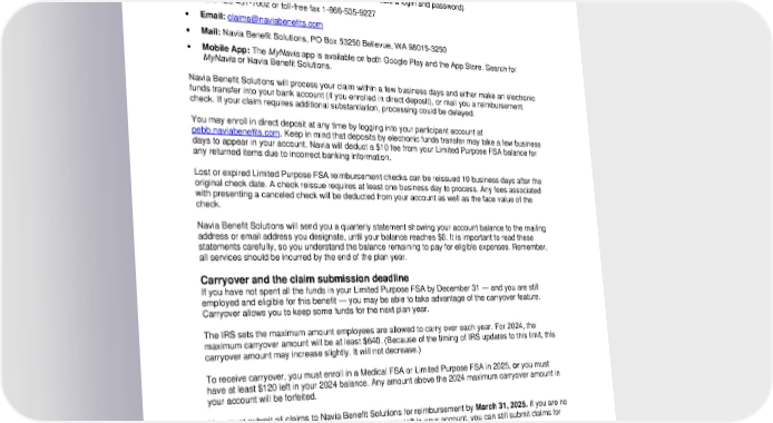 • Navia Benefit Solutions will not reimburse any expenses that occurred before your effective date of enrollment. • An expense is “incurred” when a dental or vision service occurs or the eligible item is purchased – not when you are billed, charged, or when you pay for the medical care. Navia Benefit Solutions offers several convenient ways to submit your claim and documentation. Choose one of the following: • Online: pebb.naviabenefits.com (you will need to create a login and password) • Fax: 425-451-7002 or toll-free fax 1-866-535-9227 • Email: claims@naviabenefits.com • Mail: Navia Benefit Solutions, PO Box 53250 Bellevue, WA 98015-3250 • Mobile App: The MyNavia app is available on both Google Play and the App Store. Search for MyNavia or Navia Benefit Solutions. Navia Benefit Solutions will process your claim within a few business days and either make an electronic funds transfer into your bank account (if you enrolled in direct deposit), or mail you a reimbursement check. If your claim requires additional substantiation, processing could be delayed. You may enroll in direct deposit at any time by logging into your participant account at pebb.naviabenefits.com. Keep in mind that deposits by electronic funds transfer may take a few business days to appear in your account. Navia will deduct a $10 fee from your Limited Purpose FSA balance for any returned items due to incorrect banking information. Lost or expired Limited Purpose FSA reimbursement checks can be reissued 10 business days after the original check date. A check reissue requires at least one business day to process. Any fees associated with presenting a canceled check will be deducted from your account as well as the face value of the check. Navia Benefit Solutions will send you a quarterly statement showing your account balance to the mailing address or email address you designate, until your balance reaches $0. It is important to read these statements carefully, so you understand the balance remaining to pay for eligible expenses. Remember, all services should be incurred by the end of the plan year. Carryover and the claim submission deadline If you have not spent all the funds in your Limited Purpose FSA by December 31 — and you are still employed and eligible for this benefit — you may be able to take advantage of the carryover feature. Carryover allows you to keep some funds for the next plan year. The IRS sets the maximum amount employees are allowed to carry over each year. For 2024, the maximum carryover amount will be at least $640. (Because of the timing of IRS updates to this limit, this carryover amount may increase slightly. It will not decrease.) To receive carryover, you must enroll in a Medical FSA or Limited Purpose FSA in 2025, or you must have at least $120 left in your 2024 balance. Any amount above the 2024 maximum carryover amount in your account will be forfeited. You must submit all claims to Navia Benefit Solutions for reimbursement by March 31, 2025. If you are no longer employed or have retired and still have money left in your account, you can still submit claims for reimbursement by March 31, so long as the services took place while you were employed. Carryover examples Less than $120 remaining Sharon has $100 left in her Limited Purpose FSA on December 31 (less than the $120 minimum). If she enrolls in a Limited Purpose FSA for the next year, the $100 will carry over and be added to her Limited Purpose FSA election for the next plan year. 6