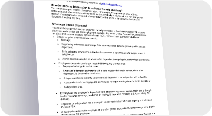 Purchasing health services and items through these merchants can lower the number of additional substantiation requests. Remember to keep your receipts in case additional proof is requested. Participating merchants generally include: • Provider offices • Dental and vision clinics • IIAS participating merchants You can find a list of IIAS participating merchants at pebb.naviabenefits.com. How do I receive information from Navia Benefit Solutions? You can choose your method of communication. For example, if you provide an email address, statements and other communications will be sent automatically to your email. You may change your method of communication or opt out of email delivery either online or by contacting Navia Benefit Solutions directly at any time. When can I make changes? You cannot change your election amount or cancel participation in the Limited Purpose FSA once the plan year starts unless you end employment, lose eligibility for the Limited Purpose FSA, or experience an event that creates a special open enrollment (SOE). Some of these events are listed below. • Employee gains a new dependent due to: o Marriage; o Registering a domestic partnership, if the state-registered domestic partner qualifies as a tax dependent; o Birth, adoption, or when the subscriber has assumed a legal obligation for support ahead of adoption; or o A child becoming eligible as an extended dependent through legal custody or legal guardianship; • Employee's dependent no longer meets PEBB eligibility criteria due to: o Employee’s change in marital status; o Employee's domestic partnership with a state registered domestic partner, who is a tax dependent, is dissolved or terminated; o A dependent losing eligibility as an extended dependent or as a dependent with a disability; o A dependent child turning age 26; or otherwise no longer meeting dependent child eligibility; or o A dependent dies. • Employee or the employee’s dependent loses other coverage under a group health plan or through health insurance coverage, as defined by the Health Insurance Portability and Accountability Act (HIPAA). • Employee or a dependent has a change in employment status that affects eligibility for the Limited Purpose FSA. • A court order requires the employee or any other person to provide insurance coverage for an eligible dependent of the employee. • Employee or an employee’s dependent enrolls in or loses eligibility for coverage under Medicaid or a state Children's Health Insurance Program (CHIP). • Employee or an employee’s dependent enrolls in or loses eligibility for coverage under Medicare. If you experience a qualifying event as described above, and need to enroll, change your election amount, or cancel your enrollment in your Limited Purpose FSA, download the PEBB Change in Status Form from pebb.naviabenefits.com. (Exception: UW and WSU employees must submit the change in status through Workday.) 8