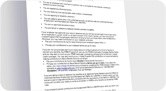 Return your PEBB Change in Status Form to your payroll or benefits office for approval. Unless stated otherwise, your employer must receive the form and evidence of the qualifying event no later than 60 days after the event. Your employer will submit the form to Navia Benefit Solutions for processing. Approved leave of absence (including Leave Without Pay) You may elect to continue your Limited Purpose FSA participation while you are on an approved leave of absence because of one of the following events: • You are on authorized Leave Without Pay (LWOP) from your agency. • Your employment ends due to a layoff. • You are an employee who reverted to a position that is not eligible for the employer contribution toward insurance coverage. • You are appealing a dismissal action. • You are receiving time-loss benefits under workers’ compensation. • You are applying for disability retirement. • You are called to active duty in the uniformed services, as defined under the Uniformed Services Employment and Reemployment Rights Act (USERRA). • You are on approved educational leave. • You are faculty or seasonal employee between periods of eligibility. If your employer has approved your leave of absence and you will have at least eight hours of pay status as an employee in a given month (or at least 5 percent of full-time for faculty), you may continue your Limited Purpose FSA through payroll deduction as long as the hours of pay status cover all deductions. Otherwise, you may make contributions to your employer as follows: • Pay your contributions during the leave directly to your employer’s payroll office, or • Pre-pay your contributions to your employer before you go on leave. If you are not using at least eight hours of pay status (or at least 5 percent of full-time for faculty) to maintain your benefits, the PEBB Program will mail you the PEBB Continuation Coverage Election Notice and you may elect to continue your PEBB health plan coverage by self-paying the full premium (Unpaid Leave coverage). You may also continue your Limited Purpose FSA contributions on a post-tax basis by making contributions to Navia Benefit Solutions as follows: • Pay your contributions during the leave directly to Navia Benefit Solutions; or • Pre-pay your contributions to Navia Benefit Solutions before you go on leave. If you select this option, you must arrange this before going on leave by completing the PEBB Change in Status Form, available at pebb.naviabenefits.com or by calling Navia Benefit Solutions at 1-800-669-3539. (Exception: UW and WSU employees must use Workday.) If you are taking a leave of absence that qualifies as an approved Family Medical Leave Act (FMLA) or Uniformed Services Employment and Reemployment Rights Act (USERRA or military) leave, you may end all or part of required contributions consistent with the requirements of the FMLA or USERRA. This choice will not affect your ability to continue enrollment in PEBB’s other benefits as allowed by PEBB rules. If you choose to pause contributions during approved FMLA or USERRA leave, when you return, you may: • Resume participation at the same annual amount elected at the start of the plan year, with a corresponding increase in per-pay-period contributions for the rest of the plan year; or • Participate at a reduced annual amount for the plan year, and resume the per-pay-period contribution in effect before the FMLA or USERRA leave. To resume your Limited Purpose FSA, you must fill out and send the PEBB Change in Status Form and evidence of the qualifying event to your payroll or benefits office no later than 60 days after the qualifying event. Your employer will submit an approved form to Navia Benefit Solutions for processing (Exception: UW and WSU employees must use Workday). If you submit your form more than 60 days after returning to work, Navia Benefit Solutions will deny your request. 9
