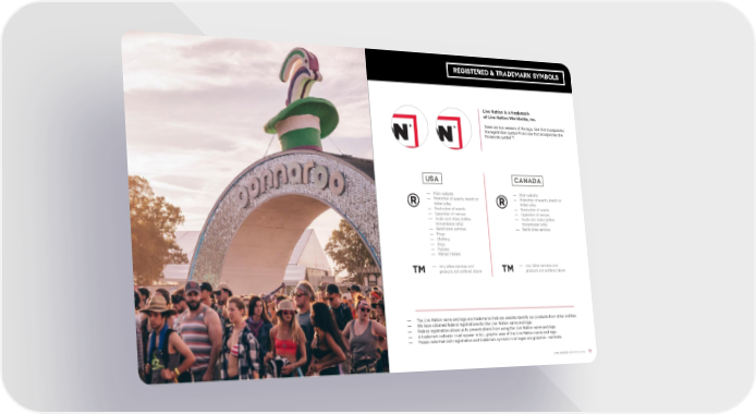 11 10 LIVE NATION BRAND GUIDE Live Nation is a trademark of Live Nation Worldwide, Inc. There are two versions of the logo. One that incorporates the registration symbol ® and one that incorporates the trademark symbol TM . — Main web site — Pr omotion of events, merch or ticket sales — Pr oduction of events — Ope ration of venues — Audio an d video (online transmission only) — Re tail store services — Mugs — Clothin g — Bag s — Po sters — Prin ted Tickets — Any o ther services and products not outlined above — Any o ther services and products not outlined above — Main web site — Pr omotion of events, merch or ticket sales — Pr oduction of events — Ope ration of venues — Audio an d video (online transmission only) — Re tail store services USA CANADA REGISTERED & TRADEMARK SYMBOLS — The Live Nation name and logo are trademarks that are used to identify our products from other entities. — We h ave obtained federal registrations for the Live Nation name and logo. — Fe deral registration allows us to prevent others from using the Live Nation name and logo. — A trade mark indicator must appear in ALL graphic uses of the Live Nation name and logo. — Plea se note that both registration and trademark symbols in all logos are graphics - not fonts.