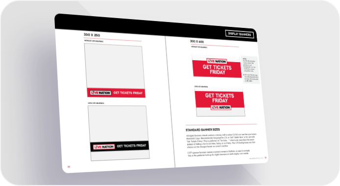 23 22 LIVE NATION BRAND GUIDE GET TICKETS FRIDAY GET TICKETS FRIDAY WITHOUT CITI GRAPHICS WITH CITI GRAPHICS 300 X 250 DISPLAY BANNERS STANDARD BANNER SIZES All digital banners should contain a strong ‘call to action’ (CTA) and use the Live Nation Horizontal Logo. Recommended language for CTA is ‘Get Tickets Now’ or for pre-sale, ‘Get Tickets Friday’. This is preferred, to “On Sale... “ which only describes the event instead of telling a fan to act Now, Today, or on Friday. The CTA background and font choice can be changed based on admat creative. CITI® sponsor banners require rounded corners at bottom, as seen in sample. This is the preferred lock up for digital banners on both display and mobile. GET TICKETS FRIDAY GET TICKETS FRIDAY WITHOUT CITI GRAPHICS WITH CITI GRAPHICS 300 X 600 NOTE: Use the black border version when fully placing on red background. Use the red border version everywhere else. OK to use Primary logo on red background here because the red border is still visible.