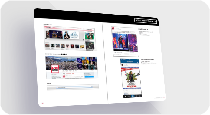 31 30 LIVE NATION BRAND GUIDE LIVENATION.COM SOCIAL MEDIA PROFILE IMAGES FAVICON SOCIAL MEDIA EXAMPLES 600 X 600 FACEBOOK CAROUSEL AD Showcase 3-5 Images and Links Text: 90 characters Headline: 40 characters Link Description: 20 characters 1080 X 1080 INSTAGRAM GRAPHIC Text only, 125 characters Recommended Image may not include more than 20% text
