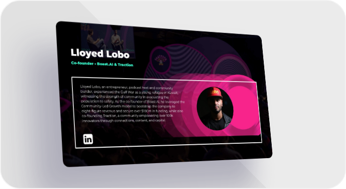 Lloyed Lobo Co-founder • Boast.AI & Traction Lloyed Lobo, an entrepreneur, podcast host and community builder, experienced the Gulf War as a young refugee in Kuwait, witnessing the strength of community in evacuating the population to safety. As the co-founder of Boast.Al, he leveraged the Community-Led Growth model to bootstrap the company to eight-figure revenue and secure over $100m in funding, while also co-founding Traction, a community empowering over 100k innovators through connections, content, and capital.