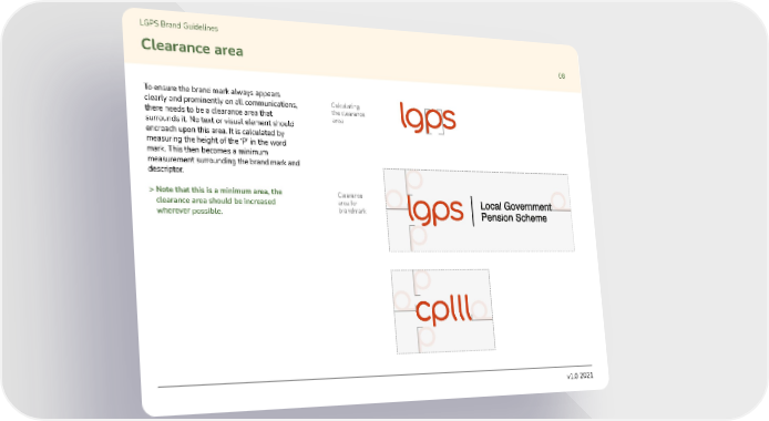 LGPS Brand Guidelines Clearance area 08 To ensure the brand mark always appears clearly and prominently on all communications, Calculating there needs to be a clearance area that the clearance surrounds it. No text or visual element should area encroach upon this area. It is calculated by measuring the height of the āPā in the word mark. This then becomes a minimum measurement surrounding the brand mark and descriptor. > Note that this is a minimum area, the Clearance clearance area should be increased area for wherever possible. brandmark v1.0 2021