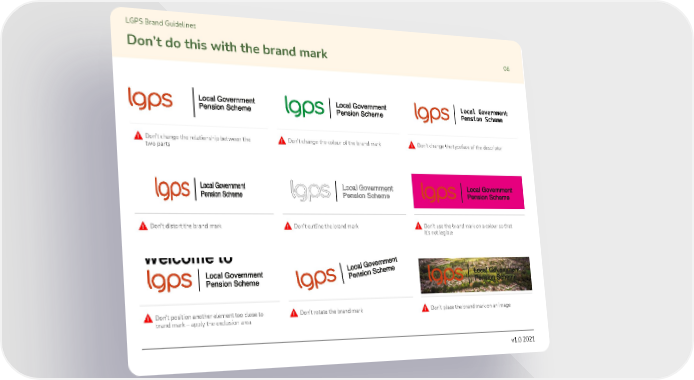 LGPS Brand Guidelines Don’t do this with the brand mark 06 Don’t change the relationship between the Don’t change the colour of the brand mark Don’t change the typeface of the descriptor two parts Don’t distort the brand mark Don’t outline the brand mark Don’t use the brand mark on a colour so that it’s not legible Welcome to Don’t position another element too close to Don’t rotate the brand mark Don’t place the brand mark on an image brand mark – apply the exclusion area v1.0 2021