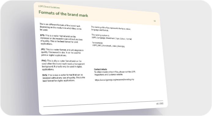LGPS Brand Guidelines Formats of the brand mark 09 There are different formats of the brand mark The naming of the files represents the type, colour, depending on the medium in which they are to language and format. be used. The naming system is: EPS: This is a vector format and can be LGPS_Language_Brandmark_Type_Colour_.Format increased or decreased in size without any loss of quality. This is the best format for print For example: applications. LGPS_ENG_Brandmark_+desc_black.jpg JPG: This is a raster format, and will degrade in quality if increased in size. It can be used for print or digital applications. PNG: This is also a raster format and can be used when the brand mark needs a transparent background. It should only be used in digital applications. Contact details To obtain master artwork files, please visit the LGPS SVG: This is also a vector format that can be Regulations and Guidance website: rescaled without any loss of quality. This is the best format for digital applications. https://www.lgpsregs.org/resources/branding.php v1.0 2021