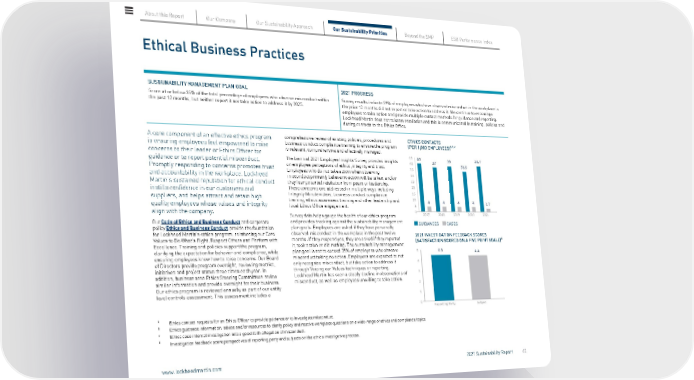 Ethical Business Practices SUSTAINABILITY MANAGEMENT PLAN GOAL Score at or below 35% of the total percentage of employees who observe misconduct within the past 12 months, but neither report it nor take action to address it by 2025. 2021 PROGRESS Survey results indicate 29% of employees who have observed misconduct in the workplace in the prior 12 months did not report or take action to address it. We continue to encourage employees to take action and provide multiple contact methods for guidance and reporting. Lockheed Martin does not tolerate retaliation and this is communicated in training, policies and during contacts to the Ethics Office. A core component of an effective ethics program is ensuring employees feel empowered to raise concerns to their leader or Ethics Officer for guidance or to report potential misconduct. Promptly responding to concerns promotes trust and accountability in the workplace. Lockheed Martin’s sustained reputation for ethical conduct instills confidence in our customers and suppliers, and helps attract and retain high quality employees whose values and integrity align with the company. Our Code of Ethics and Business Conduct and corporate policy Ethics and Business Conduct provide the foundation for Lockheed Martin’s ethics program, reinforcing our Core Values to Do What’s Right, Respect Others and Perform with Excellence. Training and policies support the program, clarifying the expectation for behavior and compliance, while ensuring employees know how to raise concerns. Our Board of Directors provide program oversight, reviewing metrics, initiatives and project status three times each year. In addition, business area Ethics Steering Committees review similar information and provide oversight for their business. Our ethics program is reviewed annually as part of our entity level controls assessment. This assessment includes a comprehensive review of existing policies, procedures and business conduct compliance training to ensure the program is relevant, comprehensive and effectively managed. The biennial 2021 Employee Insights Survey provides insights on employee perceptions of ethics, integrity and trust. Employees who do not take action when observing misconduct primarily believe no action will be taken, and/or they fear potential retaliation from peers or leadership. These concerns are addressed in multiple ways including Integrity Minute videos, business conduct compliance training, ethics awareness training and other leadership and local Ethics Office engagement. Survey data helps gauge the health of our ethics program and provides tracking against the sustainability management plan goals. Employees are asked if they have personally observed misconduct in the workplace in the past twelve months. If they respond yes, they are asked if they reported it, took action or did nothing. The sustainability management plan goal is not to exceed 35% of employees who observe misconduct taking no action. Employees are expected to not only recognize misconduct, but take action to address it through Voicing our Values techniques or reporting. Lockheed Martin has seen a steady decline in observations of misconduct, as well as employees unwilling to take action. ETHICS CONTACTS (PER 1,000 EMPLOYEES) a,b,c 2021 INVESTIGATION FEEDBACK SCORES (SATISFACTION SCORED ON A FIVE POINT SCALE) d a Ethics contact requests for an Ethics Officer to provide guidance or to investigate misconduct. b Ethics guidance information, advice and/or resources to clarify policy and resolve workplace questions on a wide-range of ethics and compliance topics. c Ethics case internal investigation into a good-faith allegation of misconduct. d Investigation feedback score perspectives of reporting party and subjects on the ethics investigative process. About this Report Our Company Our Sustainability Approach Our Sustainability Priorities Beyond the SMP ESG Performance Index www.lockheedmartin.com 2021 Sustainability Report 40
