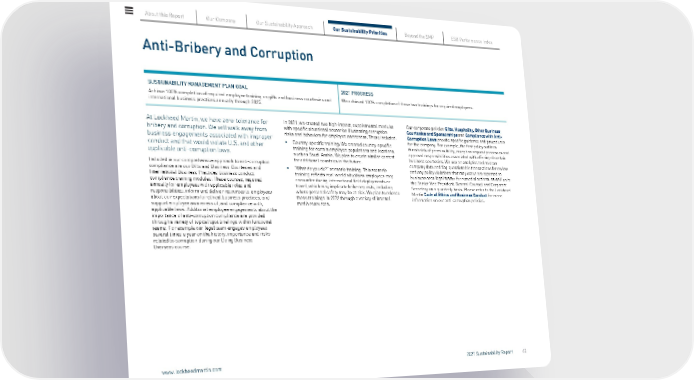 Anti-Bribery and Corruption SUSTAINABILITY MANAGEMENT PLAN GOAL Achieve 100% completion of required employee training on gifts and business courtesies and international business practices annually through 2025. 2021 PROGRESS We achieved 100% completion of these two trainings for required employees. At Lockheed Martin, we have zero-tolerance for bribery and corruption. We will walk away from business engagements associated with improper conduct and that would violate U.S. and other applicable anti-corruption laws. Included in our comprehensive approach to anti-corruption compliance are our Gifts and Business Courtesies and International Business Practices business conduct compliance training modules. These courses, required annually for employees with applicable roles and responsibilities, inform and deliver resources to employees about our expectations for ethical business practices, and support employee awareness of, and compliance with, applicable laws. Additional employee engagements about the importance of anti-corruption compliance are provided through a variety of topical spot briefings within functional teams. For example our legal team engages employees several times a year on the history, importance and risks related to corruption during our Doing Business Overseas course. In 2021, we created two high-impact, supplemental modules with specific situational scenarios illustrating corruption risks and behaviors for employee awareness. These included: • Country-specific training: We created country-specific training for certain employee populations and locations, such as Saudi Arabia. We plan to create similar content for additional countries in the future. • “What do you do?” scenario training: This scenario training reflects real-world situations employees may encounter during international field deployments or travel, which may implicate bribe requests, including where personal safety may be at risk. We plan to release these trainings in 2022 through a variety of internal media resources. Our corporate policies Gifts, Hospitality, Other Business Courtesies and Sponsorships and Compliance with Anti- Corruption Laws provide specific guidance and procedures for the company. For example, the first policy outlines thresholds of permissibility, exception request processes and approval responsibilities associated with offering of certain business courtesies. We use an analytics tool to scan company data and flag questionable transactions for review and any policy violations that may occur are reported to business area legal teams for remedial actions, as well as to the Senior Vice President, General Counsel and Corporate Secretary on a quarterly basis. Please refer to the Lockheed Martin Code of Ethics and Business Conduct for more information on our anti-corruption policies. About this Report Our Company Our Sustainability Approach Our Sustainability Priorities Beyond the SMP ESG Performance Index www.lockheedmartin.com 2021 Sustainability Report 42