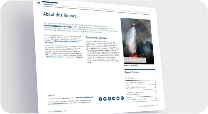 About this Report Lockheed Martin is proud to present our 2021 Sustainability Report, which is available at sustainability.lockheedmartin.com . Unless otherwise noted, this report includes global data and activities for the calendar year 2021 from Lockheed Martin’s corporate offices and four business areas: Aeronautics, Missiles and Fire Control, Rotary and Mission Systems and Space. This report has been prepared in accordance with the Global Reporting Initiative (GRI): Core Option. Our select GRI and Sustainability Accounting Standards Board (SASB) indices are available on our Environmental, Social and Governance (ESG) Portal . DNV, an independent, third-party assurance provider, assured this report to a moderate level of assurance under the AA 1000 Assurance Standard (AA1000AS). This includes performance on the Lockheed Martin 2025 Sustainability Management Plan goals, select SASB standards and select GRI indicators. Verification details can be found in the 2021 Assurance Statement , which is available on our ESG Portal . Propelled by Principle Lockheed Martin develops innovative technology that enables growth, resiliency and security of societies around the world. We develop these engineering solutions while upholding our Core Values to Do What’s Right, Respect Others and Perform with Excellence. This is why Lockheed Martin has chosen the theme “Propelled by Principle” to describe our sustainability approach. We are committed to the principles described throughout this report, including integrity, high ethical business standards, workplace safety, employee diversity and inclusion and environmental stewardship. Our principles guide us as we address complex, global challenges and propel towards a brighter future. ABOUT THE COVER PHOTO Report Contents Version 1.1 For questions on this report, please contact sustainability.lm@lmco.com . For more general information on Lockheed Martin, visit our website at www.lockheedmartin.com and social media on the following pages: Our Company 3 Our Sustainability Approach 8 Our Sustainability Priorities 13 Beyond the Sustainability Management Plan 43 2021 ESG Performance Index 53 About this Report Our Company Our Sustainability Approach Our Sustainability Priorities Beyond the SMP ESG Performance Index www.lockheedmartin.com 2021 Sustainability Report 2