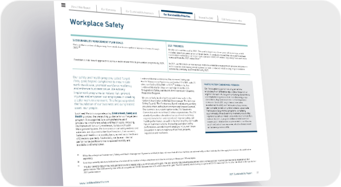 Workplace Safety SUSTAINABILITY MANAGEMENT PLAN GOALS Reduce the number of days away from work due to occupational injury or illness through 2025. 20 2021 PROGRESS We did not meet this goal in 2021. This goal is based on a three-year rolling average, which included data from years prior to the pandemic. An analysis showed that we would have been successful in achieving our target if occupational COVID-19 related days away from work were removed from the 2021 calculation. 21 Establish a risk-based approach to serious incident and fatality prevention programs by 2025. In 2021, we finalized our new serious incidents or fatalities management process, integrated it within our incident management system tool and conducted initial testing. Implementation across the company is planned for early 2022. Our safety and health program, called Target Zero, goes beyond compliance to ensure safe work conditions, promote workforce resiliency and enhance business value. We actively implement programs to reduce risk, prevent injuries and empower our employees in creating a safer work environment. This helps us protect the foundation of our business and our greatest asset: our people. Lockheed Martin’s corporate policy Environment, Safety and Health provides the overarching guidance for our Target Zero program. It is supported by a comprehensive set of procedures on different safety and health topics, including the framework for our Environment, Safety and Health Management System. Performance on our safety metrics and initiatives are reported to the Vice President, Environment, Safety and Health on a monthly basis, as well as to the Board of Directors quarterly. Additionally, we have an internal performance dashboard that is updated monthly and available to all employees. Lockheed Martin’s enterprise Environment, Safety and Health Management System is certified to ISO 45001, with 25 sites certified to ISO 45001 in 2021. 19 Additionally, five Lockheed Martin facilities are participants in the U.S. Occupational Safety and Health Administration’s Voluntary Protection Program. We are actively involved with organizations such as the National Association of EHS&S Management, The National Safety Council, The Conference Board and industry working groups to share safety best practices and lessons learned. One example is our participation in the Z16 Standards Committee with more than 20 other organizations. The Z16 standard provides a broadened scope of metrics to help organizations better understand and improve safety and health performance, as well as the impact safety and health has on business success. Measuring workplace safety performance extends beyond employee injury and illness prevention to include topics such as fleet, property, reputation and resilience. PARTICIPATORY ERGONOMICS PROGRAM Our Participatory Ergonomics program allows employees from different areas to become part of an ergonomics team in charge of conducting assessments and implementing solutions in manufacturing areas identified as high and moderate risk for ergonomic stressors. Since 2011, eight teams have been established. In 2020, two Participatory Ergonomics teams implemented comprehensive and sustainable Participatory Ergonomics programs, completing approximately three dozen improvement projects that represented an estimated cost avoidance of almost $2.6 million. In 2021, a program enhancement train-the- trainer pilot initiative was implemented in our Missiles and Fire Control business area, which will enable and enhance ergonomic skills. 19 While the enterprise Environment, Safety and Health Management System is certified, it does not mean that all of our facilities are automatically certified. Individual facilities apply for inclusion in the certification separately. 20 Lost days severity rate is calculated as a function of the number of days away from work due to an injury or illness per 100 employees. 21 The 2021 severity rate without occupational COVID illnesses was 4.32, which was within goal. The 2021 severity rate including occupational COVID illness was 5.81. No other identified trends impacted our 2021 performance. The 2020 severity rate without occupational COVID illnesses was 4.26, which was within goal. The 2020 severity rate including occupational COVID illness was 5.06. No other identified trends impacted our 2020 performance. About this Report Our Company Our Sustainability Approach Our Sustainability Priorities Beyond the SMP ESG Performance Index www.lockheedmartin.com 2021 Sustainability Report 37