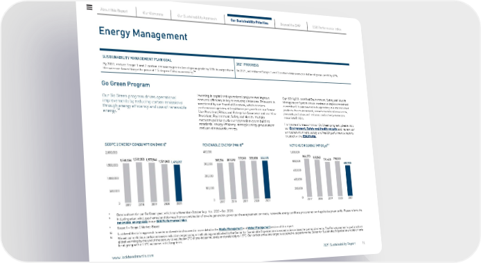 Energy Management SUSTAINABILITY MANAGEMENT PLAN GOAL By 2030, reduce Scope 1 and 2 carbon emissions per dollar of gross profit by 70% to outperform the science-based target to prevent 1.5 degree Celsius warming. 14 2021 PROGRESS In 2021, we reduced Scope 1 and 2 carbon emissions per dollar of gross profit by 47%. Go Green Program Our Go Green program drives operational improvements by reducing carbon emissions through energy efficiency and use of renewable energy. 13 Investing in capital and operational projects that improve resource efficiency is key to reducing emissions. This work is sanctioned by our Board of Directors, which receives performance updates at least twice per year from our Senior Vice President, Ethics and Enterprise Assurance and our Vice President, Environment, Safety and Health. Multiple corporate policies guide our approach to green building standards, energy efficiency, strategic energy procurement and use of renewable energy. Our ISO 14001-certified Environment, Safety and Health Management System drives continuous improvement and commits all business areas to operating in a manner that protects the environment, conserves natural resources, prevents pollution and reduces and actively manages associated risks. For more information on our Go Green program, please visit our Environment, Safety and Health website and review our annual environment, safety and health performance reports located on the ESG Portal . SCOPE 2 ENERGY CONSUMPTION (MWH) a RENEWABLE ENERGY (MWH) ab NET GHG EMISSIONS (MT CO 2 e) a c a Data is shown for our Go Green year, which runs November-October (e.g. Nov. 2020 - Oct. 2021) b Including solar, wind, geothermal and biomass from a combination of on-site generation, power purchase agreement contracts, renewable energy certificate procurement and applicable green tariffs. Please refer to the renewable energy data in our ESG Performance Index . c Scope 1 + Scope 2 Market-Based 13 Lockheed Martin’s approach to water and waste is discussed in more detail in the Waste Management and Water Management section of this report. 14 We set our ambitious carbon emission reduction target using a methodology established by the Center for Sustainable Organizations to exceed science-based target requirements. The Paris Agreement’s goal is to limit global warming by the end of the century to well below 2°C of pre-industrial levels and preferably to 1.5°C. Our carbon emissions target is expected to outperform the Center for Sustainable Organizations model criteria for aligning with a 1.5°C outcome in the long-term. About this Report Our Company Our Sustainability Approach Our Sustainability Priorities Beyond the SMP ESG Performance Index www.lockheedmartin.com 2021 Sustainability Report 16