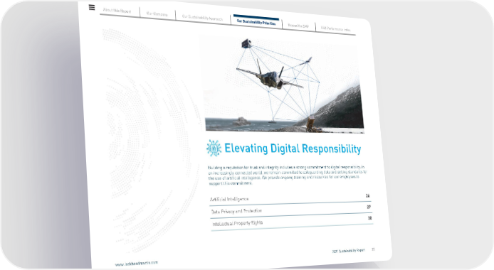 Elevating Digital Responsibility Building a reputation for trust and integrity includes a strong commitment to digital responsibility. In an increasingly connected world, we remain committed to safeguarding data and setting standards for the use of artificial intelligence. We provide ongoing training and resources for our employees to support this commitment. Artificial Intelligence 26 Data Privacy and Protection 27 Intellectual Property Rights 30 About this Report Our Company Our Sustainability Approach Our Sustainability Priorities Beyond the SMP ESG Performance Index www.lockheedmartin.com 2021 Sustainability Report 25