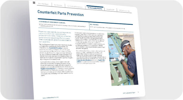 Counterfeit Parts Prevention SUSTAINABILITY MANAGEMENT PLAN GOAL Achieve 100% completion rate of applicable training on the identification and reporting of counterfeit parts by 2025. 2021 PROGRESS In 2021, we achieved more than a 99% completion rate on applicable training. Mission success depends on providing products and services that have trusted reliability, performance and safety. Preventing counterfeit parts from entering Lockheed Martin’s supply chain is one way we uphold this commitment to our customers. The Vice President, Global Supply Chain Operations provides oversight of the counterfeit prevention program. Our corporate policy, Counterfeit Prevention , guides the prevention, detection and mitigation of counterfeit work across our company. Business areas can have additional procedures specific to their unique operations. Additionally, we have a Corporate Counterfeits integrated product team that includes quality assurance representatives from each business area to provide subject matter expertise and guide day-to-day prevention management. Lockheed Martin purchase orders contain terms and conditions on counterfeit mitigation provisions, and we require all acquisitions to begin with original equipment manufacturers and authorized distributors. Please see our Supplier Code of Conduct for a summary of these counterfeit parts expectations. Counterfeit prevention is included in contract purchasing system reviews conducted annually at rotating facilities and during need-based customer quality audits. As the dynamic global landscape evolves and our adversaries continue to insert new counterfeit parts into supply chains, Lockheed Martin is championing a preventative approach. Through our new sustainability management plan goal to achieve a 100% completion rate of applicable training on the identification and reporting of counterfeit parts by 2025, we not only build awareness of the topic, but equip our employees with the tools needed to identify counterfeit parts and take appropriate action if a suspect part is detected. Appropriate actions may include notification, quarantining of parts and investigations. Our customers depend on our mission-critical products and services. Including counterfeit parts prevention in our sustainability management plan gives our customers confidence in our efforts to prevent substandard and unreliable parts from entering our supply chain and helps us retain their business now and into the future. Please visit the Frequently Asked Questions section of our Supplier Wire website for supplier resources on preventing counterfeit parts from entering our supply chain. About this Report Our Company Our Sustainability Approach Our Sustainability Priorities Beyond the SMP ESG Performance Index www.lockheedmartin.com 2021 Sustainability Report 15
