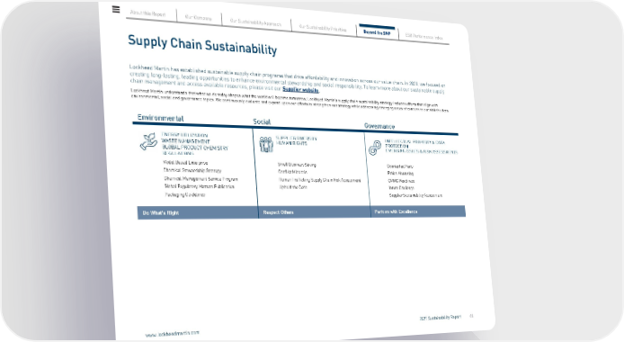 Supply Chain Sustainability Lockheed Martin has established sustainable supply chain programs that drive affordability and innovation across our value chain. In 2021, we focused on creating long-lasting, leading opportunities to enhance environmental stewardship and social responsibility. To learn more about our sustainable supply chain management and access available resources, please visit our Supplier website . Lockheed Martin understands that what we do today shapes what the world will become tomorrow. Lockheed Martin’s supply chain sustainability strategy includes efforts that align with environmental, social and governance topics. We continuously evaluate and expand upon our efforts to strengthen our strategy while addressing emerging areas of concern to our stakeholders. Environmental Social Governance ENERGY UTILIZATION WASTE MANAGEMENT GLOBAL PRODUCT CHEMISTRY REGULATIONS SUPPLIER DIVERSITY HUMAN RIGHTS INTELLECTUAL PROPERTY & DATA PROTECTION EMERGING ISSUES & RISK ASSESSMENTS Model Based Enterprise Chemical Stewardship Strategy Chemical Management Service Program Global Regulatory Matters Publication Packaging Guidelines Small Business Strong Conflict Minerals Human Trafficking Supply Chain Risk Assessment Uphold the Code Counterfeit Parts Ethics Mentoring CMMC Readiness Intern Challenge Supplier Sustainability Assessment Do What’s Right Respect Others Perform with Excellence About this Report Our Company Our Sustainability Approach Our Sustainability Priorities Beyond the SMP ESG Performance Index www.lockheedmartin.com 2021 Sustainability Report 46