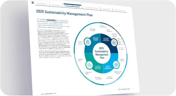 2025 Sustainability Management Plan Our corporate Sustainability policy establishes a standard approach for integrating sustainability practices across Lockheed Martin. Our sustainability management plan defines our goals and drives our sustainability progress. To create the sustainability management plan, we first develop core sustainability issues through extensive engagement with internal and external stakeholders and an analysis of industry trends. The core issues ultimately selected for the sustainability management plan represent those most material to our stakeholders and our business. After the core issues are established, we work with internal stakeholders to create specific sustainability goals for which we track our performance. These goals can be retired and/or updated, if necessary, based on our progress and the changing needs of our business. We also continually monitor environmental, social and governance risks and opportunities to stay informed of shifting and emerging trends. In 2020, we developed our 2025 Sustainability Management Plan to guide our sustainability efforts over the following five years and, for some efforts, longer. Our 2025 Sustainability Management Plan comprises four sustainability priorities that contain individual core issues and goals. About this Report Our Company Our Sustainability Approach Our Sustainability Priorities Beyond the SMP ESG Performance Index www.lockheedmartin.com 2021 Sustainability Report 11