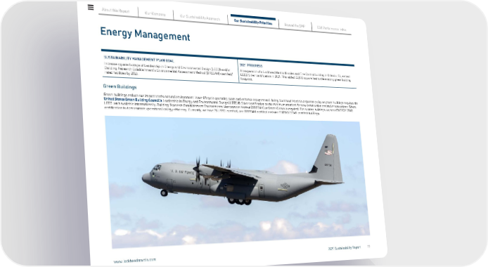 Energy Management SUSTAINABILITY MANAGEMENT PLAN GOAL Increase square footage of Leadership in Energy and Environmental Design (LEED)-and/or Building Research Establishment’s Environmental Assessment Method (BREEAM)-certified/ rated facilities by 2025. 2021 PROGRESS An expansion of a Lockheed Martin Missiles and Fire Control building in Orlando, FL, earned LEED Silver certification in 2021. This added 22,000 square feet to the existing green building footprint. Green Buildings Green buildings reduce our impact on the natural environment, lower lifecycle operating costs and enhance occupant well-being. Lockheed Martin’s corporate policy on green buildings requires the United States Green Building Council’s Leadership in Energy and Environmental Design (LEED)® Silver certification as the minimum standard for new construction and major renovations. Where LEED isn’t available internationally, Building Research Establishment Environmental Assessment Method (BREEAM) or Green Globes is required. For existing buildings, we seek ENERGY STAR certification to demonstrate operational energy efficiency. Currently, we have 25 LEED-certified, one BREEAM-certified and nine ENERGY STAR-certified buildings. About this Report Our Company Our Sustainability Approach Our Sustainability Priorities Beyond the SMP ESG Performance Index www.lockheedmartin.com 2021 Sustainability Report 19