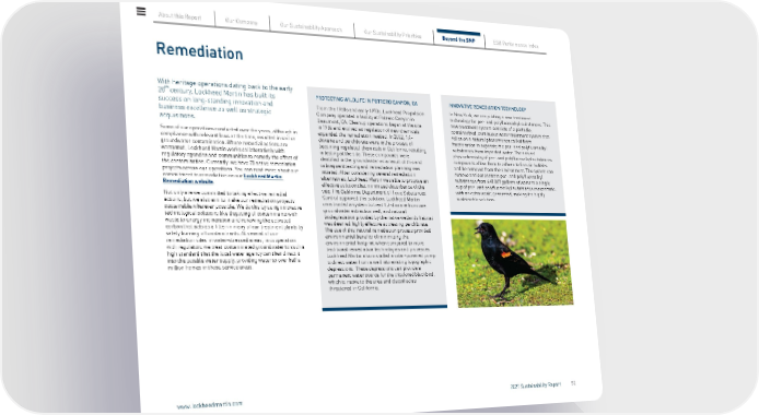 Remediation With heritage operations dating back to the early 20 th century, Lockheed Martin has built its success on long-standing innovation and business excellence as well as strategic acquisitions. Some of our operations conducted over the years, although in compliance with relevant laws at the time, resulted in soil or groundwater contamination. Where remedial actions are warranted, Lockheed Martin works collaboratively with regulatory agencies and communities to remedy the effect of the contamination. Currently, we have 73 active remediation projects across our operations. You can read more about our commitment to remediation on our Lockheed Martin Remediation website . Not only are we committed to taking effective remedial actions, but we also aim to make our remediation projects sustainable wherever possible. We do this by using innovative technological solutions like disposing of contaminants with waste to energy incineration and renewing the activated carbon that acts as a filter in many of our treatment plants by safely burning off contaminants. At several of our remediation sites in water-stressed areas, in cooperation with regulators we treat contaminated groundwater to such a high standard that the local water agency can then direct it into the potable water supply, providing water to over half a million homes in those service areas. PROTECTING WILDLIFE IN POTRERO CANYON, CA From the 1960s and early 1970s, Lockheed Propulsion Company operated a facility at Potrero Canyon in Beaumont, CA. Cleanup operations began at the site in 1986 and evolved as regulation of new chemicals expanded the remediation needed. In 2002, 1,4- dioxane and perchlorate were in the process of becoming regulated chemicals in California, resulting in testing at the site. These compounds were identified in the groundwater as a result of this and subsequent testing and remediation planning was initiated. After considering several remediation alternatives, Lockheed Martin was able to propose an effective solution that minimized disturbance of the site. The California Department of Toxic Substances Control approved this solution. Lockheed Martin constructed a system to treat 1,4-dioxane from one groundwater extraction well, and natural biodegradation provided by the native wetlands habitat was deemed highly effective at treating perchlorate. The use of this natural remediation process provided environmental benefits of minimizing the environmental footprint when compared to more traditional remediation technologies and processes. Lockheed Martin also installed a solar-powered pump to direct water from a well into existing topographic depressions. These depressions can provide a permanent water source for the tricolored blackbird, which is native to the area and classified as threatened in California. INNOVATIVE REMEDIATION TECHNOLOGY In New York, we are piloting a new treatment technology for per- and polyfluoroalkyl substances. This new treatment system consists of a portable, containerized, continuous water treatment system that relies on a natural phenomenon called foam fractionation to separate the per- and polyfluoroalkyl substances from impacted water. The natural physiochemistry of per- and polyfluoroalkyl substances compounds allow them to adhere to fine air bubbles and be removed from the environment. The system can remove and concentrate per- and polyfluoroalkyl substances from 660,000 gallons of water to a single cup of per- and polyfluoroalkyl substances concentrate, with no extra waste generated, making it a highly sustainable solution. About this Report Our Company Our Sustainability Approach Our Sustainability Priorities Beyond the SMP ESG Performance Index www.lockheedmartin.com 2021 Sustainability Report 52
