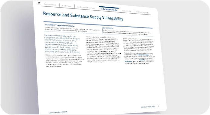 Resource and Substance Supply Vulnerability SUSTAINABILITY MANAGEMENT PLAN GOAL Increase traceability of critical mineral resources, and substances used in the supply chain, through data analysis and mitigation for signature programs by 2025. 2021 PROGRESS In 2021, we focused on building awareness of critical mineral resources, identifying the cross- functional team needed to achieve the goal and defining a charter to guide our efforts. The objective of sustainable supply chain management at Lockheed Martin is to ensure alignment of our supplier’s social, ethical, environmental and safety and health responsibilities with our own sustainability commitments. We focus on topics such as conflict minerals, chemical stewardship, environmental impact and counterfeit parts. At a minimum of every three years, we conduct a supplier sustainability voluntary assessment to gain insight into our suppliers’ environmental, social and governance programs to better understand risks and opportunities. In the off-years, we conduct various focus activities, such as our 2020 cybersecurity risk assessment and our 2021 model-based enterprise assessment. In 2021, we elevated the importance of visibility into our complex supply chain. Our new sustainability management plan goal is dedicated to enhancing the tracking and traceability of critical mineral resources. As a downstream user of critical mineral resources, it is challenging to trace the upstream origins of all our product components—from raw material extraction to manufacturers and suppliers to final integration into products at our facilities. Through knowledge of where the raw materials we depend on originate, we can make active purchasing decisions to reduce environmental and social risks in our value chain. This strengthens the long-term viability of our supplier base both domestically and globally. Ultimately, this helps us make sustainability-focused supplier decisions and mitigate the lifecycle impacts of our products. We also focused on building internal awareness, identifying the teams required to provide and analyze resource data and defining our roadmap. We also started a pilot project with one of our signature programs. This pilot program consists of mapping out a selected set of critical mineral resources to their associated product components. We aim to gather lessons learned and expand the effort to other programs throughout the business areas by the end of 2022. Additional information on sustainability within our supply chain can be found on our Supplier Wire website . Our Conflict Minerals Reports, U.K. Gender Pay Gap Reports, U.K. Modern Slavery Act Reports and supporting corporate policies can be found on our ESG Portal . Please visit the Human Rights page of this report for more information on how Lockheed Martin addresses human rights. About this Report Our Company Our Sustainability Approach Our Sustainability Priorities Beyond the SMP ESG Performance Index www.lockheedmartin.com 2021 Sustainability Report 23