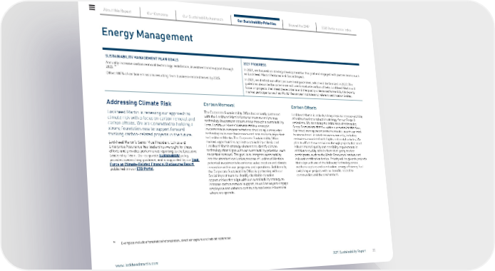 Energy Management SUSTAINABILITY MANAGEMENT PLAN GOALS Annually increase carbon removal technology installation, investment and support through 2025. 16 Offset 100% of carbon emissions resulting from business-related travel by 2025. 2021 PROGRESS In 2021, we focused on strategy development for this goal and engaged with partner teams such as Lockheed Martin Ventures and Social Impact. In 2021, we drafted our offset procurement guidelines, which will be finalized in 2022. The guidelines describe the criteria we will use to evaluate carbon offsets. Lockheed Martin will focus on projects that meet these criteria and the quality criteria set forward by third-party market participants such as World Resources Institute and relevant certification bodies. Addressing Climate Risk Lockheed Martin is renewing our approach to climate risk with a focus on carbon removal and carbon offsets. We are committed to building a strong foundation now to support forward- thinking carbon-related projects in the future. Lockheed Martin’s Senior Vice President, Ethics and Enterprise Assurance has leadership oversight for these efforts and provides performance reporting to the Executive Leadership Team. Our corporate Sustainability policy provides overarching guidance, and is supported by our Task Force on Climate-Related Financial Disclosures Report published on our ESG Portal . Carbon Removal The Corporate Sustainability Office has recently partnered with the Lockheed Martin Ventures team to analyze new technology investment opportunities through a sustainability lens. Lockheed Martin Ventures makes strategic investments in companies that are developing cutting edge technologies in core businesses and new markets important to Lockheed Martin. The Corporate Sustainability Office reviews opportunities against sustainability criteria and Lockheed Martin strategy elements to identify climate technology that aligns with our sustainability priorities, such as carbon removal. The goal is to integrate sustainability into the standard evaluation process of Lockheed Martin’s potential investments to enhance value creation and climate innovation within our programs and operations. Additionally, the Corporate Sustainability Office is partnering with our Social Impact team to identify charitable donation opportunities that align with our sustainability strategy to increase carbon removal support, as well as ways to engage employees and enhance community resilience in locations where we operate. Carbon Offsets Lockheed Martin is actively taking steps to increase visibility of and to develop a reduction strategy for our Scope 3 emissions. We are taking the initial step of addressing Scope 3 emissions that are within our control at this time. Our travel management partners provide us with our total business travel-related emissions annually, including emissions associated with flights and rental vehicles. We plan to offset these emissions through projects that meet robust internal quality and credibility requirements in addition to quality criteria from third-party market participants, such as the World Resources Institute and relevant certification bodies. Priority will be given to projects that align with one of the following technology areas: methane capture and combustion, energy efficiency, fuel switching or projects with co-benefits related to communities and the environment. 16 Examples include afforestation/reforestation, direct air capture and habitat restoration. About this Report Our Company Our Sustainability Approach Our Sustainability Priorities Beyond the SMP ESG Performance Index www.lockheedmartin.com 2021 Sustainability Report 20