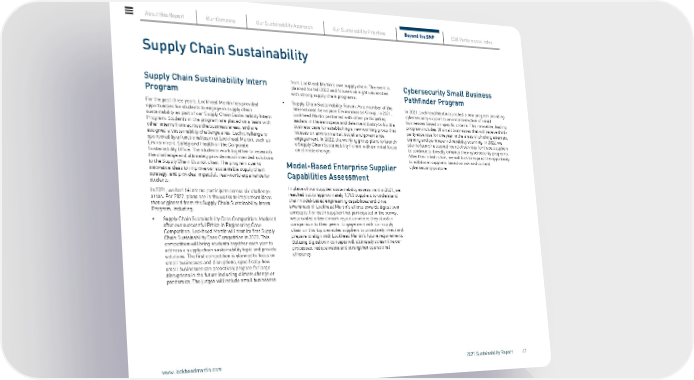 Supply Chain Sustainability Supply Chain Sustainability Intern Program For the past three years, Lockheed Martin has provided opportunities for students to engage in supply chain sustainability as part of our Supply Chain Sustainability Intern Program. Students in the program are placed on a team with other interns from across the business areas, and are assigned a sustainability challenge area. Each challenge is sponsored by a functional team at Lockheed Martin, such as Environment, Safety and Health or the Corporate Sustainability Office. The students work together to research the challenge and ultimately provide recommended solutions to the Supply Chain Council chair. The program sparks innovative ideas to improve our sustainable supply chain strategy, and provides impactful, real-world experience for students. In 2021, we had 16 interns participate across six challenge areas. For 2022, plans are in the works to implement ideas that originated from the Supply Chain Sustainability Intern Program, including: • Supply Chain Sustainability Case Competition: Modeled after our successful Ethics in Engineering Case Competition, Lockheed Martin will host its first Supply Chain Sustainability Case Competition in 2022. This competition will bring students together each year to address a supply chain sustainability topic and provide solutions. The first competition is planned to focus on small businesses and disruptions, specifically how small businesses can proactively prepare for large disruptions in the future including climate change or pandemics. The judges will include small businesses from Lockheed Martin’s own supply chain. The event is planned for fall 2022 and focuses on eight universities with strong supply chain programs. • Supply Chain Sustainability Forum: As a member of the International Aerospace Environmental Group, in 2021, Lockheed Martin partnered with other participating leaders in the aerospace and defense industry to build a business case for establishing a new working group that focuses on environmental, social and governance engagement. In 2022, the working group plans to launch a Supply Chain Sustainability Forum with an initial focus on climate change. Model-Based Enterprise Supplier Capabilities Assessment In place of our supplier sustainability assessment in 2021, we reached out to approximately 1,700 suppliers to understand their model-based engineering capabilities and drive awareness of Lockheed Martin’s efforts towards digital twin concepts. For each supplier that participated in the survey, we provided a benchmark report on where they stood in comparison to their peers. Engagement with our supply chain on this topic enables suppliers to proactively invest and prepare to align with Lockheed Martin’s future requirements. Utilizing digital twin concepts will ultimately streamline our processes, reduce waste and strengthen operational efficiency. Cybersecurity Small Business Pathfinder Program In 2021, Lockheed Martin launched a new program providing cybersecurity support to an initial selection of small businesses based on specific criteria. This innovative, leading program includes 50 small businesses that will receive third- party expertise for one year in the areas of phishing attempts, training and perimeter vulnerability scanning. In 2022, we plan to launch a second round of services for these suppliers to continue to directly enhance their cybersecurity programs. After this initial cohort, we will look to expand the opportunity to additional suppliers based on risk and current cybersecurity posture. About this Report Our Company Our Sustainability Approach Our Sustainability Priorities Beyond the SMP ESG Performance Index www.lockheedmartin.com 2021 Sustainability Report 47