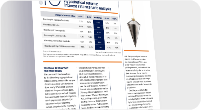 BONDS Hypothetical returns: fig. Interest rate scenario analysis 10 Change in interest rates: -1.0% -0.5% No change +0.5% +1.0% Bloomberg US Aggregate Bond Index 12.3% 9.5% 5.2% 3.9% 1.1% Bloomberg MBS Index 12.7% 10.0% 5.4% 4.4% 1.6% Bloomberg US Treasury Index 11.0% 8.3% 4.5% 2.9% 0.2% Bloomberg US Corporate Index 14.2% 11.0% 6.1% 4.7% 1.5% Bloomberg Intermediate Corp Index 10.3% 8.5% 6.0% 4.9% 3.1% Bloomberg US High Yield Corporate Index* 11.9% 10.2% 7.4% 6.6% 4.8% Source: LPL Research 10/24/22 *Assumes 6% Default Rate and 40% Recovery Rate Rate forecasts may not develop as predicted and are subject to change. Indexes are unmanaged and cannot be invested into directly. risk, the opportunity set in shorter Past performance is not a guarantee of future results. maturity fixed income securities has improved as well. With 1- and 2-year Treasury securities both THE ROAD TO RECOVERY for performance over the next year yielding above 4%, cash and cash-like FOR CORE BONDS would be the index’s starting yield instruments finally offer an attractive The core bond index (as defined (dark blue highlighted section). yield. Moreover, shorter maturity by the Bloomberg Aggregate Bond Although, if interest rates decline by investment grade corporate securities Index) is seeing losses unlike any year 0.5%, the Bloomberg Aggregate Bond are offering yields in line with longer since its inception. Core bonds are Index could return more than 9% maturity corporate credit securities— down nearly 16% in 2022 and have over the next 12 months. Moreover, if without the same level of interest rate wiped out five years of index gains. interest rates move back into the low or credit risk. But because bonds are both financial 3% range, the core bond index could One thing to consider is that instruments and financial obligations, return around 12% over the next year. because starting yields are the best which pay coupons and principal Also, and importantly, given where predictor of future returns over the repayments at par when they starting yields are, if interest rates maturity of a fixed income instrument, mature, the potential for recovery is increase by another 1% from current by taking on that additional interest a bit more certain than in the equity levels, fixed income markets broadly rate risk and owning a full market markets that rely primarily on price could still generate positive returns core bond portfolio, investors would appreciation. So, how long will it take over the next 12 months. Given be “locking in” investments at higher to recover this year’s losses? the move higher in yields we have yields for a longer period of time. If Here are some expectations for experienced this year, we think the interest rates do fall from current various fixed income markets under risk/reward for owning core bonds levels, investors that are in shorter different interest rate scenarios has improved. maturity securities would then have to [Fig. 10]. If interest rates don’t However, for investors that don’t reinvest proceeds at lower rate levels. change at all, the best expectation want to take on a lot of interest rate So for investors with an investment LPL RESEARCH