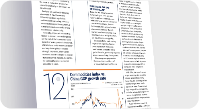 OUTLOOK 2023 The commodity super cycle spurred In addition, an end of the Ukraine- more vulnerable as the strong by China’s hyper-growth rate in the Russia conflict could help extract dollar weakens demand. Emerging beginning of the century has waned some of the uncertainty embedded in markets with dollar-denominated significantly [Fig. 12]. As China’s agricultural, oil, and an assortment sovereign debt and corporate debt leadership has focused on containing of metal commodities that have been tend to struggle to service the debt COVID-19 at all costs, the once strong whipsawed by the ongoing warfare. as the dollar strength intensifies. economy has stagnated. Additionally, Japan has suffered through the the boom in real estate projects has CURRENCIES—THE END U.S. rate cycle, watching the yen fall slowed dramatically as developers are OF KING DOLLAR? to nearly defenseless levels against mired in debt. To say the U.S. dollar has vaulted the dollar. Much of this is due to Analysts are continually debating higher during the Fed’s rate hike the Bank of Japan’s insistence on when—and if—Xi will ease zero- cycle would be an understatement. keeping the yield on the Japanese COVID-19 lockdown regulations Whether it is the result of the interest 10-year bond in an extremely low and introduce compelling stimulus rate differential (that is, that the and tight range as it adheres to a measures to support the economy, a Fed has been more aggressive than policy called Yield Curve Control scenario in which commodity pricing other central banks) or that U.S. (YCC). Rather than raising rates, could recover substantially. markets have been attracting more the world’s third largest economy Generally, important contributing investments from foreign investors, has kept rates steady via YCC, but factors to support commodity prices the result has been staggering. has been forced to intervene in are the end of the interest rate cycle The strong dollar, while making currency markets to raise the yen by central banks, particularly the Fed, imports less expensive, has put against the dollar. Until the Fed or which in turn, could weaken the dollar pressure on many of the large markets make it clear that the rate and help foster global economic multinational companies with a hike cycle is nearing an end, the yen strength. Moreover, when China’s global footprint, particularly as global will continue to be subject to bouts economic backdrop begins to recover economies are facing slower growth. of extreme vulnerability as long from the current malaise, the signals Also, many emerging markets as YCC remains in place. However, for commodity prices to recover that export commodities and/ the weaker yen can help Japanese should be in place. or import basic commodities are companies compete against U.S. companies in the competitive export market. Commodities index vs. With China, the world’s second largest economy, also not raising fig. China GDP growth rate interest rates as its economy BLOOMBERG COMMODITY CHINA GDP CONSTANT PRICE languishes, the Chinese yuan has INDEX (CUMULATIVE YoY) been hovering at lower levels 250 20 against the dollar. Concerns over regulatory policies, transparency, 12 200 15 and what actions the Xi regime will take to strengthen the economy 10 have culminated in many questions 150 rather than answers. 5 As the Fed moves toward its 100 final interest rate hike, a path that 0 could take many months, the dollar should lose some of its seemingly 50 -5 relentless force and fall to levels that are commensurate with offering 0 2001 2006 2011 2016 2022-10 stability to global markets, but also helping U.S. companies compete for Source: LPL Research, Indexes are unmanaged and cannot be invested into directly. business internationally. Bloomberg 11/15/22 Past performance is not a guarantee of future results. 14
