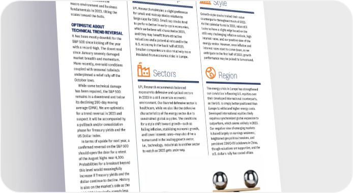 STOCKS S&P 500 earnings in 2024, while our Equity asset allocation recommendations bull case of 5,100, which we see as slightly more likely than the bear case, is based on 20 times $255 per share in S&P 500 earnings in 2024. Market cap Style We look for stocks to find better balance between the macro environment and business LPL Research maintains a slight preference Growth-style stocks trailed their value fundamentals in 2023, tilting the for small and midcap stocks relative to counterparts throughout much of 2022. scales toward the bulls. large caps for 2023. Small cap stocks tend As the calendar turns to 2023, value still to perform better in early-cycle economies, looks to have a slight edge based on the OPTIMISTIC ABOUT which we believe will characterize 2023, still very challenging inflation outlook, high TECHNICAL TREND REVERSAL and they may benefit from attractive interest rates, and our positive view of the It has been mostly downhill for the valuations and a potential rebound in the energy sector. However, once inflation and S&P 500 since kicking off the year U.S. economy in the back half of 2023. interest rates start to come down, as we with a record-high. The downtrend Smaller companies are also relatively more anticipate in the first half of 2023, growth since January severely damaged insulated from economic risks in Europe. performance may be poised to turn around. market breadth and momentum. More recently, oversold conditions coupled with seasonal tailwinds Sectors Region underpinned a relief rally off the October lows. While some technical damage LPL Research recommends balanced The energy crisis in Europe has strengthened has been repaired, the S&P 500 exposure to defensive and cyclical sectors our conviction in favoring U.S. equities over remains in a downtrend and below in 2023 in a still uncertain economic their developed international counterparts, its declining 200-day moving environment. Our favored defensive sector is as the U.S. is simply better positioned than average (DMA). We are optimistic healthcare, while we also like the defensive Europe to withstand higher energy costs. for a trend reversal in 2023 and characteristics of the energy sector due to Developed international equities likely suspect it will be accompanied by constrained global supplies. The conditions require a synchronized global expansion to a pullback and/or consolidation for a style shift toward growth—such as outperform, which seems unlikely in 2023. phase for Treasury yields and the falling inflation, stabilizing economic growth, Our negative view of emerging markets US Dollar Index. and lower interest rates—may also drive a is based largely on earnings weakness, In terms of upside for next year, a turnaround in the leading growth sector, heightened geopolitical tensions, and confirmed reversal on the S&P 500 i.e., technology. Industrials is another sector persistent COVID-19 lockdowns in China, should open the door for a retest to watch as 2023 gets underway. though valuations are supportive, and the of the August highs near 4,300. U.S. dollar's rally has cooled of late. Probabilities for a breakout beyond this level would meaningfully increase if Treasury yields and the dollar continue to decline. History is also on the market’s side as the S&P 500 historically spends less than 30% of all trading days below its 200-DMA (since 1950). During this timeframe, whenever the index held below the 200-DMA for a six- month period, forward 12-month average and median returns were 14.2% and 18.3%, respectively. LPL RESEARCH