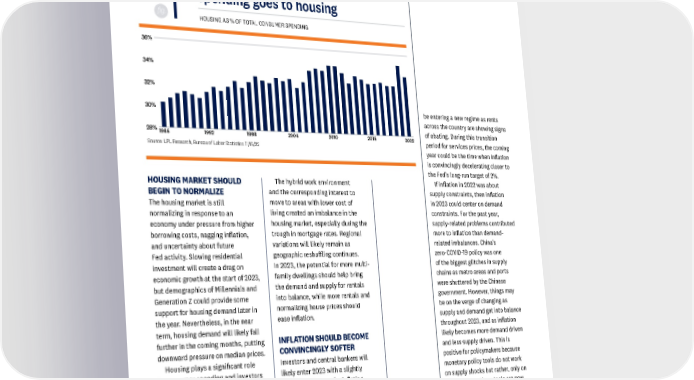 ECONOMY A third of consumer spending goes to housing fig. 4HOUSING AS % OF TOTAL CONSUMER SPENDING 36% 34% 32% 30% be entering a new regime as rents across the country are showing signs 28% of abating. During this transition 1986 1992 1998 2004 2010 2016 2022 period for services prices, the coming Source: LPL Research, Bureau of Labor Statistics 11/15/22 year could be the time when inflation is convincingly decelerating closer to the Fed’s long-run target of 2%. HOUSING MARKET SHOULD The hybrid work environment If inflation in 2022 was about BEGIN TO NORMALIZE and the corresponding interest to supply constraints, then inflation The housing market is still move to areas with lower cost of in 2023 could center on demand normalizing in response to an living created an imbalance in the constraints. For the past year, economy under pressure from higher housing market, especially during the supply-related problems contributed borrowing costs, nagging inflation, trough in mortgage rates. Regional more to inflation than demand- and uncertainty about future variations will likely remain as related imbalances. China’s Fed activity. Slowing residential geographic reshuffling continues. zero-COVID-19 policy was one investment will create a drag on In 2023, the potential for more multi- of the biggest glitches in supply economic growth at the start of 2023, family dwellings should help bring chains as metro areas and ports but demographics of Millennials and the demand and supply for rentals were shuttered by the Chinese Generation Z could provide some into balance, while more rentals and government. However, things may support for housing demand later in normalizing house prices should be on the verge of changing as the year. Nevertheless, in the near ease inflation. supply and demand get into balance term, housing demand will likely fall throughout 2023, and as inflation further in the coming months, putting INFLATION SHOULD BECOME likely becomes more demand driven downward pressure on median prices. CONVINCINGLY SOFTER and less supply driven. This is Housing plays a significant role Investors and central bankers will positive for policymakers because in consumer spending and investors likely enter 2023 with a slightly monetary policy tools do not work should monitor the housing market different trajectory for inflation, on supply shocks but rather, only on as a bellwether for the health particularly services inflation. In demand; thus, these tools are now of the consumer. Consumers recent months, durable goods prices more relevant than they were when spend roughly 34% of their total have clearly decelerated—and in inflation was primarily from supply spending on housing [Fig. 4], so a some cases, outright declined—but bottlenecks. So as supply constraints decline in housing-related costs services prices have been stubbornly ease and as Fed tools become more should give consumers more for accelerating as rent prices and health impactful, we could see the rate of discretionary spending. services rose. We could potentially inflation decelerating further in 2023. LPL RESEARCH