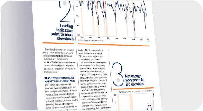 OUTLOOK 2023 LEADING ECONOMIC INDEX (6-MO % CHANGE) RECESSIONS 10% 5% fig. 0% 2-5% Leading -10% indicators point to more -15% 1958 1966 1974 1982 1990 1998 2006 2014 2022 slowdown Source: LPL Research, Conference Board 10/20/22 Even though investors are tempted workers [Fig. 3]. Investors should to say “this time is different,” we all watch these metrics throughout can take note of general principles 2023 as the economy leads to a about business cycles and the more balanced labor market. markets. The Fed has warned that the We expect the ratio of openings to current inflation fight will be painful, unemployed to fall as the economy so a dip into a recession should not be slows and firms cut their number of that surprising. job openings. Firms often quickly respond to a slowing economy: during Not enough READJUSTMENTS IN THE JOB the 2008 financial crisis, the number MARKET COULD LESSEN PAIN of openings fell by 50% in roughly 16 fig. workers to fill The Fed has repeatedly warned months, so this metric could revert 3job openings investors about the potential for pain quickly. The persistent problem of from the fight with inflation. That pain individuals out of the labor force is mostly likely associated with an has kept the labor market tight, but RATIO OF OPENINGS TO UNEMPLOYED RECESSIONS expected increase in unemployment a potential improvement in labor 2.0 as the job market cools from a slowing force participation in the prime age economy. The Job Openings and population (25–54 year olds) with Labor Turnover report was hardly on improved productivity would be a 1.5 center stage, until Fed Chair Jerome powerful remedy. And in terms of firms’ Powell used a press conference to struggle to find qualified workers, the 1.0 highlight the number of job openings coming year will reveal how firms are in the economy. The pandemic caused responding to current labor market these three metrics to become off conditions and any potential impact 0.5 balance: the ratio of openings to this may have on businesses. If the unemployed, the number of those not labor force grows back to its pre- 0 in the labor force, and the percent of pandemic trend, many of these near- 2002 2006 2010 2014 2018 2022 firms having difficulty finding qualified term conditions would improve. Source: LPL Research, Bureau of Labor Statistics, 11/07/22 04