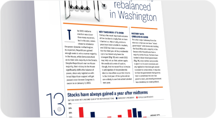 Sec. POLICY Power dynamic rebalanced in Washington he 2022 midterm KEY TAKEAWAY: IT’S OVER HISTORY SAYS election was closer Perhaps the most important outcome GRIDLOCK IS GOOD T than many expected, of the election is simply that we have The other major takeaway from the but in the end, voters it behind us. Historically, midterm election is that we now have “mixed chose to rebalance years have been volatile for markets, government” with Democrats holding the power dynamic in Washington. and 2022 has been no exception. the Oval Office and a majority in the As expected, Republicans gained But the third year of the presidential Senate while Republicans have a enough seats to win a narrow majority cycle has historically been the majority in the House. Markets have in the House, while Democrats held strongest [Fig. 13] and a weak 2022 tended to favor mixed government on to their slim majority in the Senate. may help set up that pattern again. [Fig. 14], since neither party is able Despite Republican’s narrow House We would add a note of caution, to give in to its worst excesses and majority, their victory in the House though, that increased fiscal stimulus any legislation that does get passed significantly shifts the balance of in anticipation of the presidential is subject to compromise. It may also power, since only legislation with election has often supported returns be that the government that governs broad bipartisan support will get in the third year of the cycle and we best is sometimes the one that passed once the new Congress is are unlikely to see that added tailwind governs least, and mixed government sworn in on January 3, 2023. next year. has a tendency to create gridlock. Stocks have always gained a year after midterms S&P 500 INDEX RETURNS ONE YEAR AFTER MIDTERM ELECTIONS DEMOCRATIC PRESIDENT REPUBLICAN PRESIDENT 35% fig. 30% 13 25% 20% 15% AVERAGE: 14.7% 10% 5% 0% 1950 1954 1958 1962 1966 1970 1974 1978 1982 1986 1990 1994 1998 2002 2006 2010 2014 2018 Source: LPL Research, FactSet 11/15/22 All indexes are unmanaged and cannot be invested into directly. Past performance is no guarantee of future results. The modern design of the S&P 500 Index was first launched in 1957. Performance before then incorporates the performance of its predecessor index, the S&P 90. LPL RESEARCH