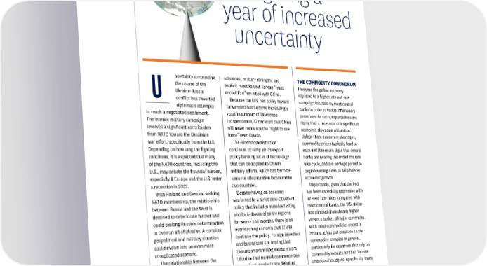Sec. GEOPOLITICS Navigating a year of increased uncertainty ncertainty surrounding advances, military strength, and THE COMMODITY CONUNDRUM the course of the explicit remarks that Taiwan “must This year the global economy U Ukraine-Russia and will be” reunited with China. adjusted to a higher interest rate conflict has thwarted Because the U.S. has policy toward campaign initiated by most central diplomatic attempts Taiwan and has become increasingly banks in order to tackle inflationary to reach a negotiated settlement. vocal in support of Taiwanese pressures. As such, expectations are The intense military campaign independence, Xi declared that China rising that a recession or a significant involves a significant contribution will never renounce the “right to use economic slowdown will unfold. from NATO toward the Ukrainian force” over Taiwan. Unless there are severe shortages, war effort, specifically from the U.S. The Biden administration commodity prices typically tend to Depending on how long the fighting continues to ramp up its export ease until there are signs that central continues, it is expected that many policy banning sales of technology banks are nearing the end of the rate of the NATO countries, including the that can be applied to China’s hike cycle, and are perhaps poised to U.S., may debate the financial burden, military efforts, which has become begin lowering rates to help bolster especially if Europe and the U.S. enter a source of contention between the economic growth. a recession in 2023. two countries. Importantly, given that the Fed With Finland and Sweden seeking Despite having an economy has been especially aggressive with NATO membership, the relationship weakened by a strict zero-COVID-19 interest rate hikes compared with between Russia and the West is policy that includes massive testing most central banks, the U.S. dollar destined to deteriorate further and and lock-downs of entire regions has climbed dramatically higher could prolong Russia’s determination for weeks and months, there is an versus a basket of major currencies. to overrun all of Ukraine. A complex overreaching concern that Xi will With most commodities priced in geopolitical and military situation continue the policy. Foreign investors dollars, it has put pressure on the could evolve into an even more and businesses are hoping that commodity complex in general, complicated scenario. the uncompromising measures are particularly for countries that rely on The relationship between the lifted so that normal commerce can commodity exports for their income U.S. and China has become more be revived. Analysts are debating and overall budgets, specifically many challenging as China’s President whether Xi, who sees the policy as emerging markets. Xi Jinping began a third five-year the ultimate path toward eradicating Another significant factor for term, underpinned by an extensive COVID-19, will ultimately abandon, or commodity pricing is the role of China consolidation of power. At the even ease, the prohibitive regulations. and its outsized projected need for Communist Party’s 20th Although the global supply chain has Plenum in commodities. This includes a broad 2022, Xi outlined China’s objectives significantly improved, China remains spectrum of metals, agriculture, oil, and focused on technological an integral part of global trade. and building materials. LPL RESEARCH