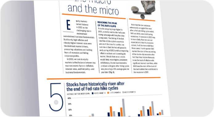 OUTLOOK 2023 STOCKS Sec. Equilibrium between the macro and the micro quity markets REACHING THE PEAK Note that the two instances lacked balance OF THE RATE CLIMB when stocks struggled the most E in 2022 as the If stocks are going to go higher in after a Fed rate hiking cycle ended, challenging macro 2023, a prompt end to the Fed’s rate 1981 and 2000, were both during environment hiking campaign will likely be a key recessions. A recession in 2023 may overwhelmed business fundamentals. component. The timing of the last be more likely than not, but our Stubbornly high inflation and rate hike of this cycle is uncertain expectation is that if a recession sharply higher interest rates were and won’t be clear for a while, but occurs, it will be more mild than the dominant market drivers, our view is that the Fed will pause in those cases. Fourth quarter 1981 pressuring valuations and inciting early spring of 2023 amid an improving marked the start of the second leg fears of recession and falling inflation outlook and loosening job of the double-dip recession after corporate profits. market. Should that occur, stocks Fed Chair Paul Volcker famously In 2023, we look to equity would likely move higher, consistent broke the back of inflation with markets to find balance between key with history. Stocks have tended to significant interest rate hikes, while macroeconomic factors—inflation, produce solid gains after hiking cycles 2000 was the start of the burst of interest rates, and Fed policy—and end, including a 10% average gain one the tech bubble that contributed to business fundamentals. year later [Fig. 5]. the recession in 2001. Stocks have historically risen after the end of Fed rate hike cycles AVERAGE S&P 500 INDEX GAIN: NEXT 3 MONTHS NEXT 6 MONTHS NEXT 12 MONTHS 40% fig. 530% 20% 10% 0% -10% -20% -30% 04/25/74 02/15/80 05/05/81 02/24/89 02/01/95 05/16/00 06/29/06 12/19/18 AVERAGE Source: LPL Research, FactSet, Ned Davis Research 11/15/22 Indexes are unmanaged and cannot be invested into directly. Past performance is not a guarantee of future results. 06