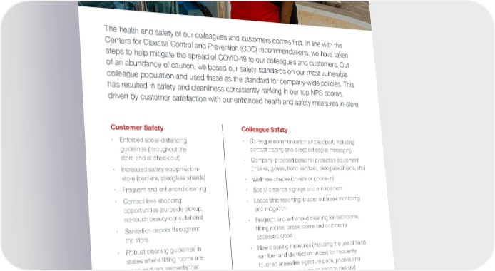 The health and safety of our colleagues and customers comes first. In line with the Centers for Disease Control and Prevention (CDC) recommendations, we have taken steps to help mitigate the spread of COVID-19 to our colleagues and customers. Out of an abundance of caution, we based our safety standards on our most vulnerable colleague population and used these as the standard for company-wide policies. This has resulted in safety and cleanliness consistently ranking in our top NPS scores, driven by customer satisfaction with our enhanced health and safety measures in-store. Responding to C OV I D -19 Customer Safety · Enforced social distancing guidelines (throughout the store and at check out) · Increased safety equipment in- store (barriers, plexiglass shields) · Frequent and enhanced cleaning · Contact-less shopping opportunities (curbside pickup, no-touch beauty consultations) · Sanitation depots throughout the store · Robust cleaning guidelines in states where fitting rooms are open and requirements that clothes that have been tried on to be left off the selling floor for a period of time Colleague Safety · Colleague communication and support, including contact tracing and direct colleague messaging · Company-provided personal protection equipment (masks, gloves, hand sanitizer, plexiglass shields, etc.) · Wellness checks (on-site or phone-in) · Social distance signage and enforcement · Leadership reporting: cluster outbreak monitoring and mitigation · Frequent and enhanced cleaning for bathrooms, fitting rooms, break rooms and commonly accessed areas · New cleaning measures (including the use of hand sanitizer and disinfectant wipes) for frequently touched areas like signature pads, phones and shared equipment, such as hand trucks and pallet jacks · Air circulation that complies with CDC ventilation guidelines | Sustainability Report 2020 Return to Table of Contents 5