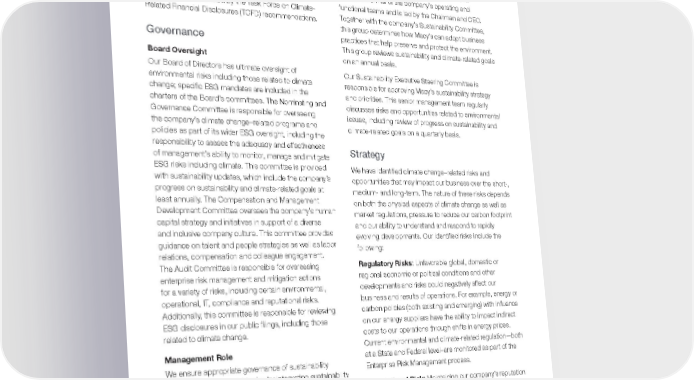 Our Approach to Climate Change Macy’s recognizes the risk climate change poses to our business and our planet. That is why we are committed to monitoring and mitigating the risks to our operations and facilities, as well as to reducing our carbon emissions. Our reporting is informed by the Task Force on Climate- Related Financial Disclosures (TCFD) recommendations. Governance Board Oversight Our Board of Directors has ultimate oversight of environmental risks including those related to climate change; specific ESG mandates are included in the charters of the Board’s committees. The Nominating and Governance Committee is responsible for overseeing the company’s climate change–related programs and policies as part of its wider ESG oversight, including the responsibility to assess the adequacy and effectiveness of management’s ability to monitor, manage and mitigate ESG risks including climate. This committee is provided with sustainability updates, which include the company’s progress on sustainability and climate-related goals at least annually. The Compensation and Management Development Committee oversees the company’s human capital strategy and initiatives in support of a diverse and inclusive company culture. This committee provides guidance on talent and people strategies as well as labor relations, compensation and colleague engagement. The Audit Committee is responsible for overseeing enterprise risk management and mitigation actions for a variety of risks, including certain environmental, operational, IT, compliance and reputational risks. Additionally, this committee is responsible for reviewing ESG disclosures in our public filings, including those related to climate change. Management Role We ensure appropriate governance of sustainability including environmental topics by integrating sustainability into our overall management model. Our Chairman and Chief Executive Officer has ultimate responsibility for climate-related strategy. Our Chief Financial Officer, Chief Legal Officer and Chief Transformation and Human Resources Officer, working with our investor relations team, engages with stakeholders on ESG issues and provides feedback to management and the Board. The Chief Supply Chain Officer, who reports directly to the CEO and Chair, is responsible for teams that manage sustainability initiatives and supply chain transparency. Our Corporate Strategy Group has executive-level members from all of the company’s operating and functional teams and is led by the Chairman and CEO. Together with the company’s Sustainability Committee, this group determines how Macy’s can adopt business practices that help preserve and protect the environment. This group reviews sustainability and climate-related goals on an annual basis. Our Sustainability Executive Steering Committee is responsible for approving Macy’s sustainability strategy and priorities. This senior management team regularly discusses risks and opportunities related to environmental issues, including review of progress on sustainability and climate-related goals on a quarterly basis. Strategy We have identified climate change–related risks and opportunities that may impact our business over the short-, medium- and long-term. The nature of these risks depends on both the physical aspects of climate change as well as market regulations, pressure to reduce our carbon footprint and our ability to understand and respond to rapidly evolving developments. Our identified risks include the following: Regulatory Risks: Unfavorable global, domestic or regional economic or political conditions and other developments and risks could negatively affect our business and results of operations. For example, energy or carbon policies (both existing and emerging) with influence on our energy suppliers have the ability to impact indirect costs to our operations through shifts in energy prices. Current environmental and climate-related regulation—both at a State and Federal level–are monitored as part of the Enterprise Risk Management process. Reputational Risk: Maintaining our company’s reputation and brand at a high level is critical to our operations and financial results. We believe our reputation and brand are partially based on the perception that we act equitably and honestly in dealing with customers, employees, business partners and shareholders. Reputational risk in relation to climate-related issues encompasses both supply chain | Sustainability Report 2020 Return to Table of Contents 19