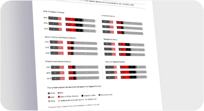 Believe that pay equity is fundamental to our culture and diversity and inclusion strategy: Macy’s is committed to the principle of equal pay for equal work and seeks to ensure our colleagues are paid equitably for substantially similar work. Colleague compensation is based on job position, responsibilities, experience and performance with incentive opportunities that allow our colleagues to share in our success. In 2021, Macy’s will achieve greater than 99% pay equity across gender and, in the U.S., across race. Monitor performance: The charts below outline representation by ethnicity and gender by level from 2018 to 2020. The numbers above represent percentages of colleague diversity. *American Indian or Alaska Native, Native Hawaiian or other Pacfic Islander Total Colleague Diversity Directors Diversity Senior Directors and Above Diversity Managers Diversity Directors and Above Diversity Hourly Colleagues Diversity | Sustainability Report 2020 Return to Table of Contents 24