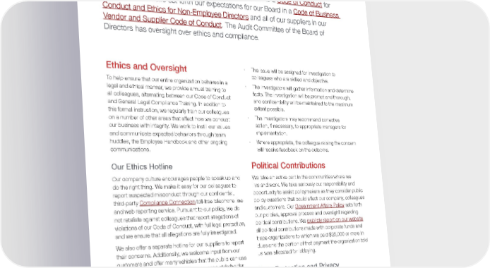 We foster a culture of ethical conduct to guide everyone in our organization, from our leaders to our colleagues and to our suppliers. We regularly share our expectations and continually monitor our organization to ensure compliance with company policies and applicable laws. In addition to a Code of Conduct for colleagues, we have set forth our expectations for our Board in a Code of Business Conduct and Ethics for Non-Employee Directors and all of our suppliers in our Vendor and Supplier Code of Conduct . The Audit Committee of the Board of Directors has oversight over ethics and compliance. Ethics and Oversight To help ensure that our entire organization behaves in a legal and ethical manner, we provide annual training to all colleagues, alternating between our Code of Conduct and General Legal Compliance Training. In addition to this formal instruction, we regularly train our colleagues on a number of other areas that affect how we conduct our business with integrity. We work to instill our values and communicate expected behaviors through team huddles, the Employee Handbook and other ongoing communications. Our Ethics Hotline Our company culture encourages people to speak up and do the right thing. We make it easy for our colleagues to report suspected misconduct through our confidential, third-party Compliance Connection toll-free telephone line and web reporting service. Pursuant to our policy, we do not retaliate against colleagues that report allegations of violations of our Code of Conduct, with full legal protection, and we ensure that all allegations are fully investigated. We also offer a separate hotline for our suppliers to report their concerns. Additionally, we welcome input from our customers and offer many vehicles that the public can use to raise issues or complaints. We encourage stakeholder and shareholder dialogue. Customers may contact us via Customer Service, U.S. mail, email, website or a convenient online Tell Us What You Think response form . The company will investigate concerns raised about compliance with company policies as follows: · The issue will be assigned for investigation to colleagues who are skilled and objective. · The investigators will gather information and determine facts. The investigation will be prompt and thorough, and confidentiality will be maintained to the maximum extent possible. · The investigators may recommend corrective action, if necessary, to appropriate managers for implementation. · Where appropriate, the colleague raising the concern will receive feedback on the outcome. Political Contributions We take an active part in the communities where we live and work. We take seriously our responsibility and opportunity to assist policymakers as they consider public policy questions that could affect our company, colleagues and customers. Our Government Affairs Policy sets forth our policies, approval process and oversight regarding political contributions. We publicly report on our website all political contributions made with corporate funds and trade organizations to which we paid $25,000 or more in dues and the portion of that payment the organization told us was allocated for lobbying. Data Protection and Privacy We recognize the importance of protecting consumer and colleague data and have robust systems, processes and practices in place to protect sensitive data. Our Corporate Information Security Officer leads our data protection | Sustainability Report 2020 Return to Table of Contents 35