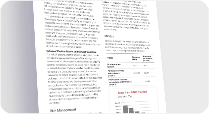 issues (e.g., supply disruption caused by weather events) and our position and progress toward cleaner energy production and consumption. Risk Related to Resource Use: There is increasing scrutiny on the use of resources—particularly energy sources and energy use. Pressure from regulators, consumers and other stakeholders to find alternatives and/or green solutions, to sharply reduce our use of natural resources are escalating. We continue to look for ways to address these issues and continue to explore developing best practices within the industry. Through memberships in industry groups such as the Sustainable Apparel Coalition (SAC), we are working to reduce the environmental and social impact of apparel and footwear products around the world. The use of recycled material textiles emits fewer GHG emissions and conserves water and energy as compared to making virgin fiber. Additionally, we have rolled out a framework to measure the social and environmental performance of over 500 facilities, benchmarking by facility type to allow comparison of performance against that of peers. Extreme Weather Events and Natural Disasters: The risk of extreme weather events is integrated into our climate change–related Enterprise Risk Management assessment. Our business could be affected by extreme weather conditions, regional or global health pandemics or natural disasters. Extreme weather conditions, such as frequent or unusually heavy snowfall, ice storms, rainstorms or natural disasters such as wildfire over a prolonged period could make it difficult for our customers to travel to our stores and thereby reduce our sales and profitability. Our business is also susceptible to unseasonable weather conditions, which could reduce demand for a portion of our inventory and reduce sales and profitability or could result in disruption or delay of materials in our supply chain or impact staffing in our stores. Risk Management Our senior leadership team and Board of Directors are focused on managing and mitigating various risks to our business and financial performance, including climate change and other environmental risks. There are several channels through which managing climate-related risks and opportunities occur internally. The Corporate Business Resiliency Group is responsible for the development, implementation and management of the enterprise Business Continuity Program and provides direction, support and related subject matter expertise to Macy’s management teams worldwide. Macy’s also has an Enterprise Risk Management program to identify and prioritize risks as substantive to the business. At committee and Board meetings throughout the year, management discusses the risk exposures identified as being most significant to the company and the related actions that management may take to monitor such exposures. The program utilizes a network of functional experts with managerial responsibility for various aspects of enterprise risk management. The Audit Committee of the Board, in particular, discusses with management the risk assessments and risk management policies relating to a variety of risks. Metrics We track our operational energy use and related Scope 1 and Scope 2 emissions. Additionally, we calculate certain Scope 3 emissions, including from our Private Brand’s upstream product transportation and distribution. FY 2020 Energy use (MWh) Greenhouse gas emissions (mt CO 2 e) Direct energy use (Scope 1) 208,277 36,870 Purchased electricity, heat and steam (Scope 2) 1,044,130 3 6 7, 6 0 1 Private Brands upstream transportation and distribution (Scope 3) 16, 390 Scope 1 and 2 GHG Emissions (metric ton CO 2 e) 900,000 800,000 700,000 600,000 500,000 400,000 300,000 200,000 100,000 0 2016 2017 2018 2019 2020 | Sustainability Report 2020 Return to Table of Contents 20