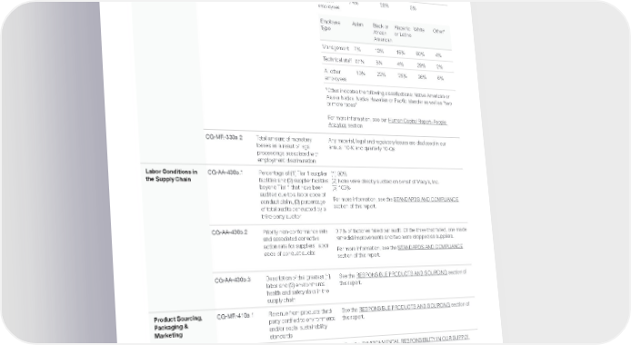 Top ic Code Accounting Metric Response Employee Recruitment, Inclusion & Performance CG-MR-330a.1 Percentage of gender and racial/ethnic group representation for (1) management (2) technical staff and (3) all other colleagues Employee Type Female Male Not Available or Not Disclosed Management 67% 33% 0% Technical staff 26% 74% 0% All other employees 74% 26% 0% Employee Type Asian Black or African American Hispanic or Latino White Other* Management 7% 13% 16% 60% 4% Technical staff 57% 8% 4% 29% 2% All other employees 10% 22% 25% 36% 6% *Other indicates the following classifications: Native American or Alaska Native, Native Hawaiian or Pacific Islander as well as “two or more races” For more information, see our Human Capital Report–People Analytics section CG-MR-330a.2 Total amount of monetary losses as a result of legal proceedings associated with employment discrimination Any material, legal and regulatory issues are disclosed in our annual 10-K and quarterly 10-Qs Labor Conditions in the Supply Chain CG-AA-430b.1 Percentage of (1) Tier 1 supplier facilities and (2) supplier facilities beyond Tier 1 that have been audited due to a labor code of conduct claim, (3) percentage of total audits conducted by a third-party auditor (1) 90% (2) None were directly audited on behalf of Macy’s, Inc. (3) 100% For more information, see the STANDARDS AND COMPLIANCE section of this report. CG-AA-430b.2 Priority non-conformance rate and associated corrective action rate for suppliers’ labor code of conduct audits 0.7% of factories failed our audit. Of the three that failed, one made remedial improvements and two were dropped as suppliers. For more information, see the STANDARDS AND COMPLIANCE section of this report. CG-AA-430b.3 Description of the greatest (1) labor and (2) environmental, health and safety risks in the supply chain See the RESPONSIBLE PRODUCTS AND SOURCING section of this report. Product Sourcing, Packaging & Marketing CG-MR-410a.1 Revenue from products third- party certified to environmental and/or social sustainability standards See the RESPONSIBLE PRODUCTS AND SOURCING section of this report. CG-MR-410a.2 CG-AA-250a.2 Discussion of processes to assess and manage risks and/ or hazards associated with chemicals in products See the ENVIRONMENTAL RESPONSIBILITY IN OUR SUPPLY CHAIN section of this report. CG-MR-410a.3 Discussion of strategies to reduce the environmental impact of packaging See the ENVIRONMENTAL MANAGEMENT section of this report. | Sustainability Report 2020 Return to Table of Contents 38