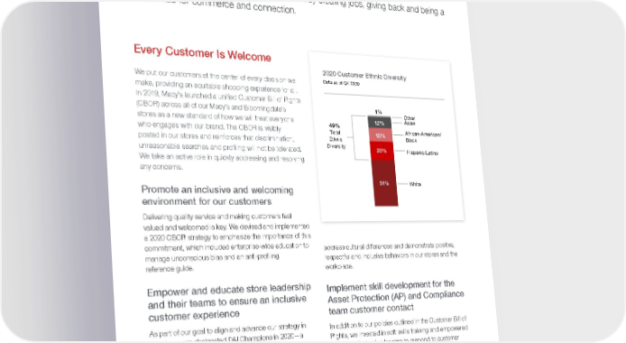 Customers and Community We are dedicated to serving our communities by creating jobs, giving back and being a vibrant hub for commerce and connection. Every Customer Is Welcome We put our customers at the center of every decision we make, providing an equitable shopping experience for all. In 2019, Macy’s launched a unified Customer Bill of Rights (CBOR) across all of our Macy’s and Bloomingdale’s stores as a new standard of how we will treat everyone who engages with our brand. The CBOR is visibly posted in our stores and reinforces that discrimination, unreasonable searches and profiling will not be tolerated. We take an active role in quickly addressing and resolving any concerns. Promote an inclusive and welcoming environment for our customers Delivering quality service and making customers feel valued and welcomed is key. We devised and implemented a 2020 CBOR strategy to emphasize the importance of this commitment, which included enterprise-wide education to manage unconscious bias and an anti-profiling reference guide. Empower and educate store leadership and their teams to ensure an inclusive customer experience As part of our goal to align and advance our strategy in the stores, we designated D&I Champions in 2020—a leadership team of dedicated experts that include store managers and district vice presidents. The Champions play a crucial role in communicating and executing the D&I strategy and commitment to delivering quality service. This year, we introduced the D&I “Inclusion in Action” WorkProud badge, which is awarded to colleagues who address cultural differences and demonstrate positive, respectful and inclusive behaviors in our stores and the workplace. Implement skill development for the Asset Protection (AP) and Compliance team customer contact In addition to our policies outlined in the Customer Bill of Rights, we invested in soft skills training and empowered our Asset Protection leaders to respond to customer concerns. In 2021, we will reinforce our commitment to quality service in all Asset Protection interactions. 2020 Customer Ethnic Diversity 51% 20% 15% 12% 1% White Hispanic/Latino African-American/ Black Asian Other Data as of Q4 2020 49% Total Ethnic Diversity | Sustainability Report 2020 Return to Table of Contents 29