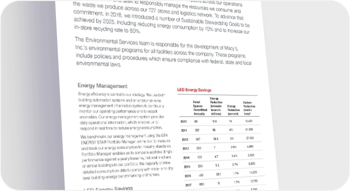 Energy Management Energy efficiency is central to our strategy. We use both building automation systems and an enterprise-wide energy management information system to continually monitor our operating performance and to detect anomalies. Our energy management system provides daily operational information, which enables us to respond in real time to reduce energy consumption. We benchmark our energy management using the EPA ENERGY STAR Portfolio Manager online tool to measure and track our energy consumption to industry standards. Portfolio Manager enables us to compare each building’s performance against a yearly baseline, national medians or similar buildings in our portfolio. We regularly provide detailed consumption data to comply with state- and city- level building-energy benchmarking ordinances. LED Energy Savings Macy’s greatest opportunity for energy reduction continues to be our lighting. By the end of 2020, an additional 40 retail spaces were retrofitted leading to a reduction of about 5.6 million kWh or 3,969 metric tons of CO 2 e. Since 2010, Macy’s has reduced total energy consumption by more than 17.8% through LED lighting retrofits. Environment Macy’s is committed to minimizing the environmental impacts across our operations and supply chain and seek to responsibly manage the resources we consume and the waste we produce across our 727 stores and logistics network. To advance that commitment, in 2018, we introduced a number of Sustainable Stewardship Goals to be achieved by 2025, including reducing energy consumption by 10% and to increase our in-store recycling rate to 80%. The Environmental Services team is responsible for the development of Macy’s, Inc.’s environmental programs for all facilities across the company. These programs include policies and procedures which ensure compliance with federal, state and local environmental laws. LED Energy Savings Retail Spaces Retrofitted Annually Energy Reduction (kilowatt- hours in millions) Energy Reduction (percent) Carbon Reduction (metric tons)* 2010 95 19.9 1% 13,400 2 011 287 58 4% 41,000 2012 307 39.5 3% 27,000 2013 260 7 0.5% 4,950 2014 100 4.7 0.4% 3,300 2015 260 8.2 0.7% 5,800 2016 450 20 .1 1.7% 14,20 0 2017 660 18 1.7% 12,700 2018 50 12.3 1.3% 8,700 2019 133 29.9 3% 21,000 2020 40 5.6 0.7% 3,969 *CO 2 e calculated using EPA emissions tool | Sustainability Report 2020 Return to Table of Contents 17