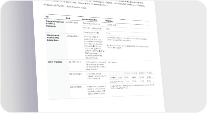 SASB Index Top ic Code Accounting Metric Response Energy Management in Retail & Distribution CG-MR-130a.1 Total energy consumed 1,252,407 MWh Percentage grid electricity 76.7% Percentage renewable 5.2% Environmental Impacts in the Supply Chain CG-AA-430a.2 Percentage of (1) Tier 1 supplier facilities and (2) supplier facilities beyond Tier 1 that have completed the Sustainable Apparel Coalition’s Higg Facility Environmental Module (Higg FEM) assessment or an equivalent environmental data assessment Approximately 200 Tier-1 factories and over 160 Tier-2 facilities shared their Higg FEM results with us. For more information, see the STANDARDS AND COMPLIANCE section of this report. Labor Practices CG-MR-310a.1 (1) Average hourly wage and (2) percentage of in-store colleagues earning minimum wage, by region Not reported CG-MR-310a.2 (1) Voluntary and (2) involuntary turnover rate for in-store colleagues FY 2018 FY 2019 FY 2020 FY 2021 Voluntary Turnover 35.9% 39.8% 26.9% 20.4% Involuntary Turnover 19.4% 20.0% 11.7% 9.8% CG-MR-310a.3 Total amount of monetary losses as a result of legal proceedings associated with labor law violation s Any material, legal and regulatory issues are disclosed in our annual 10-K and quarterly 10-Qs The disclosures in this report are informed by the recommendations of the Sustainability Accounting Standards Board (SASB). Given the diverse nature of our business, we have incorporated guidelines from the SASB Multiline and Specialty Retailers & Distributors and Apparel, Accessories & Footwear standards. All data as of FY2020, unless otherwise noted. | Sustainability Report 2020 Return to Table of Contents 37